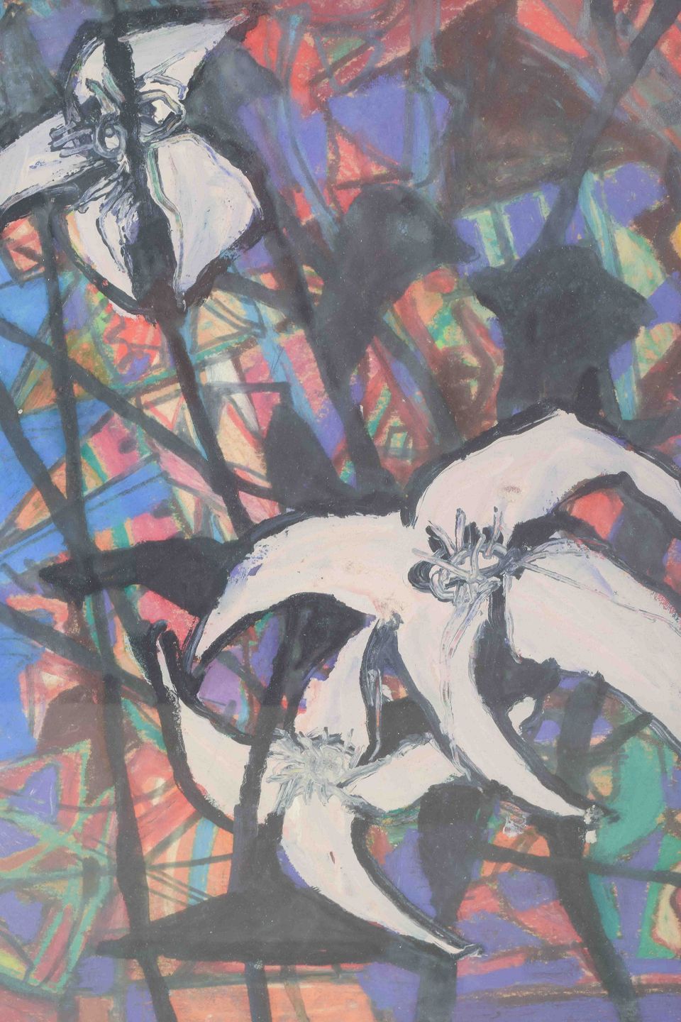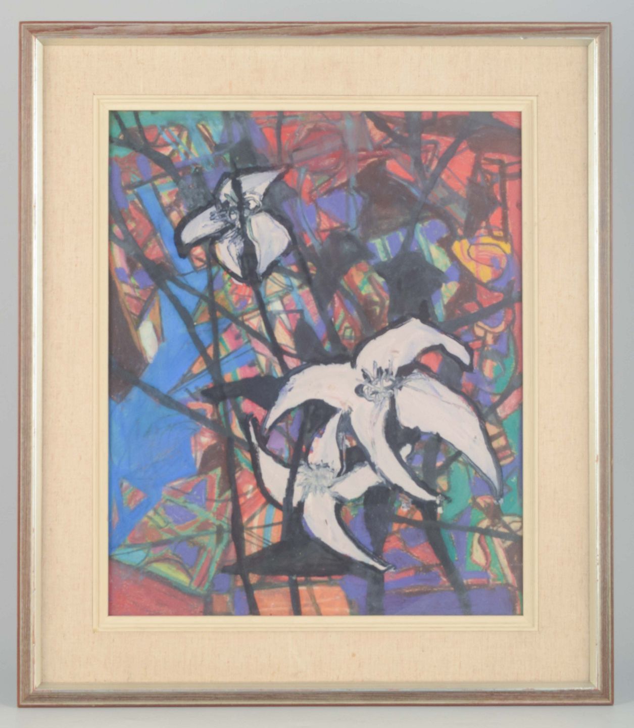 A vibrant and dynamic work where colors and forms merge in a free and expressive composition. The use of mixed techniques adds depth and texture to the surface, reflecting the experimental modernism of the period.
