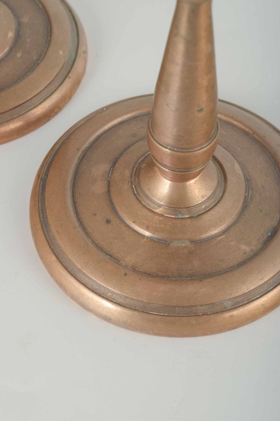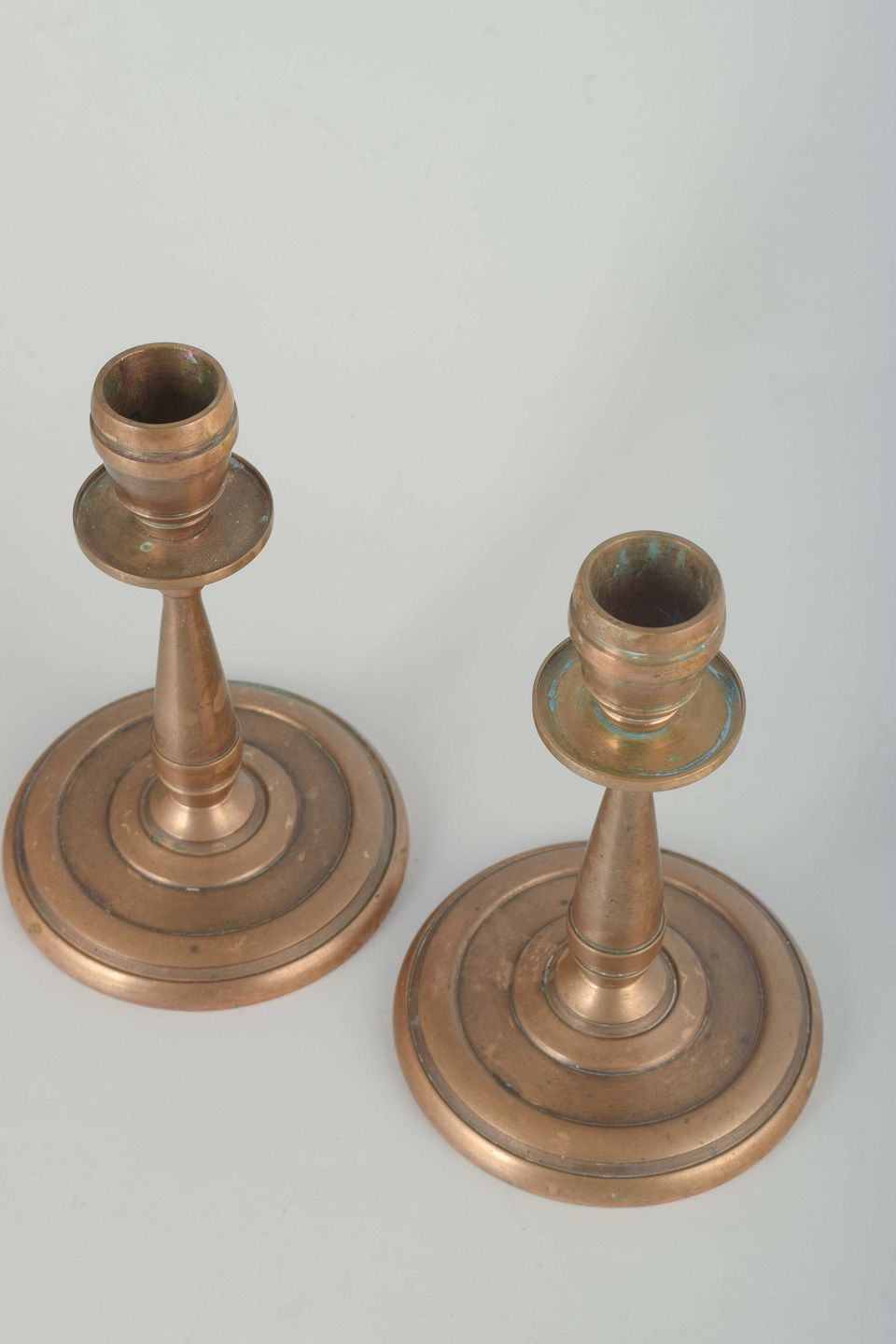 Solid brass candlesticks with circular base and geometric ring decorations, typical of the period.