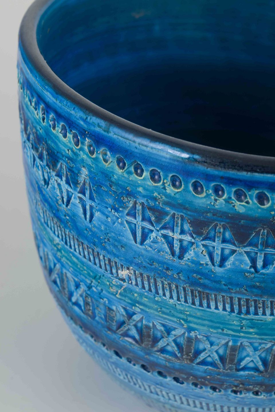 Aldo Londi (1911–2003) served as artistic director at Bitossi in Montelupo Fiorentino from 1946 until the 1980s. He created the world-famous Rimini Blu series in the 1950s, which quickly became an icon of Italian postwar design. The series is characterized by its vivid blue glazes combined with hand-incised geometric patterns, making each piece unique. Londi’s works are today highly sought-after collector’s items and represent a milestone in Italian studio ceramics.