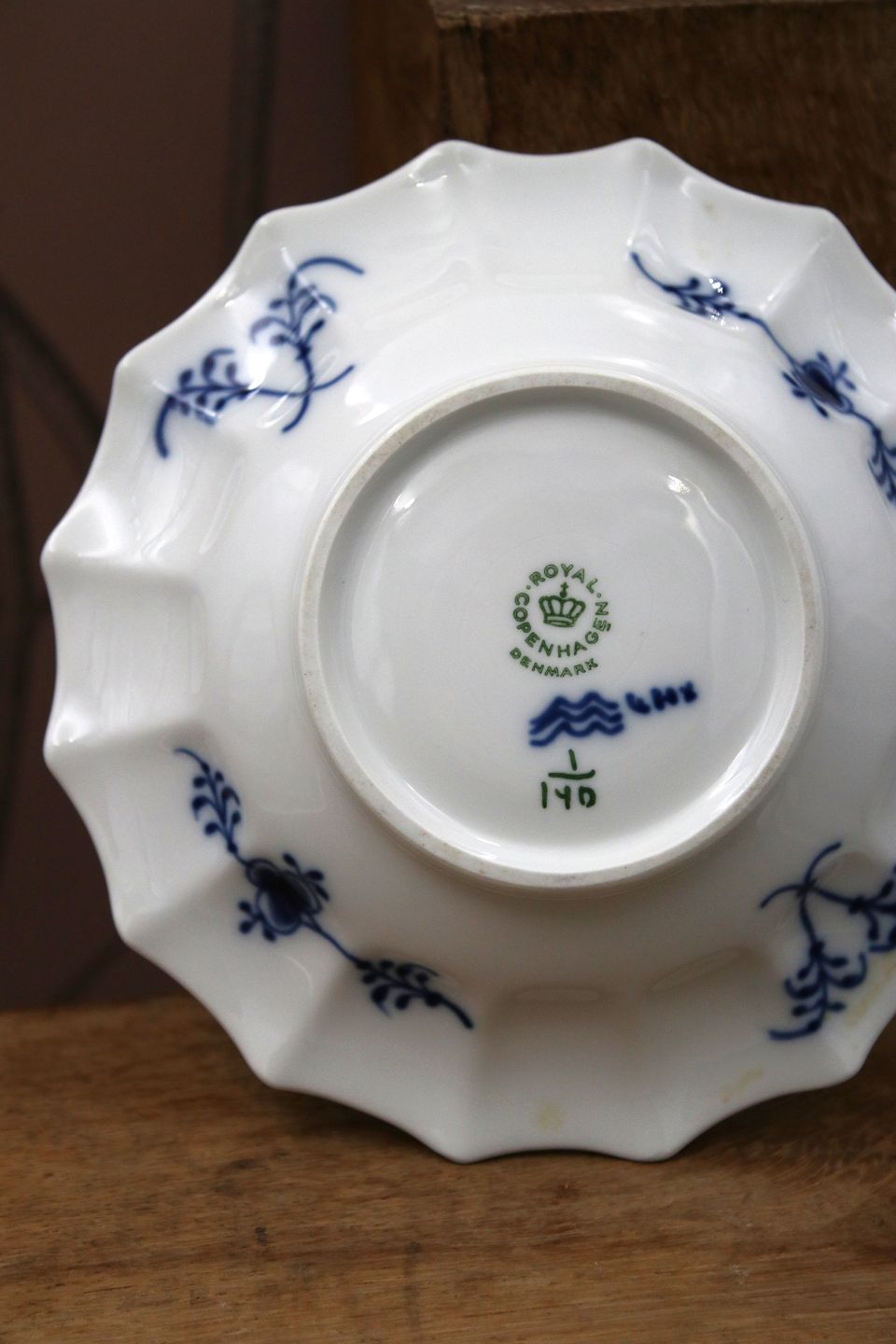 Old Blue Fluted Plain 16-sided bowl from Royal Copenhagen.H: 3.5cm. Dia.: 15cm. RC.1/140. 1.sort. in complete and fine condition.
