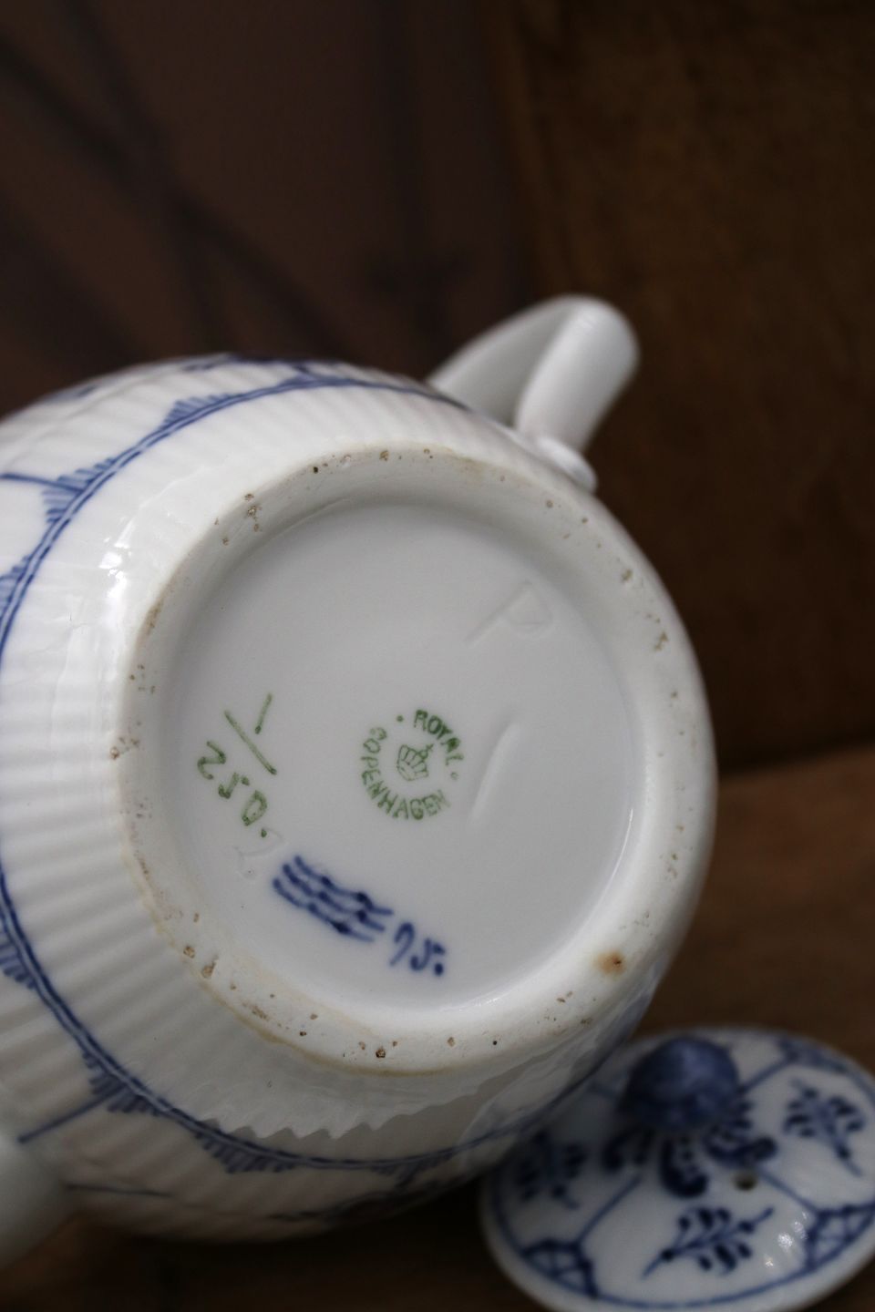 Old teapot in Blue Fluted, Plain from Royal Copenhagen from 1898-1923. Decoration number: 1/250. 1.sort. H: 12cm.The pot has old silver mounting / repair on the pouring spout. Otherwise in good condition.