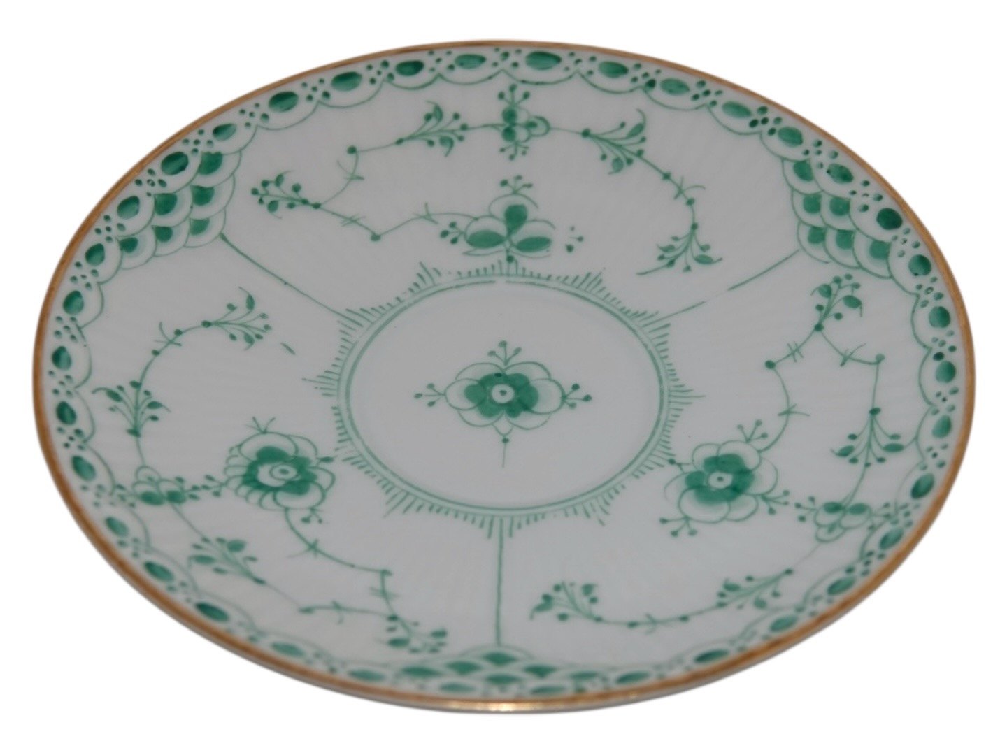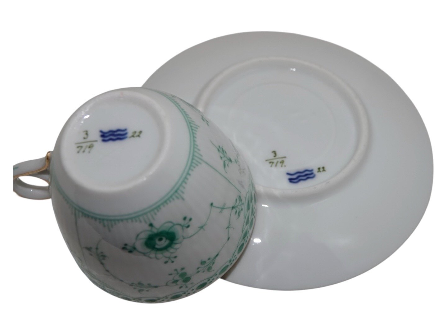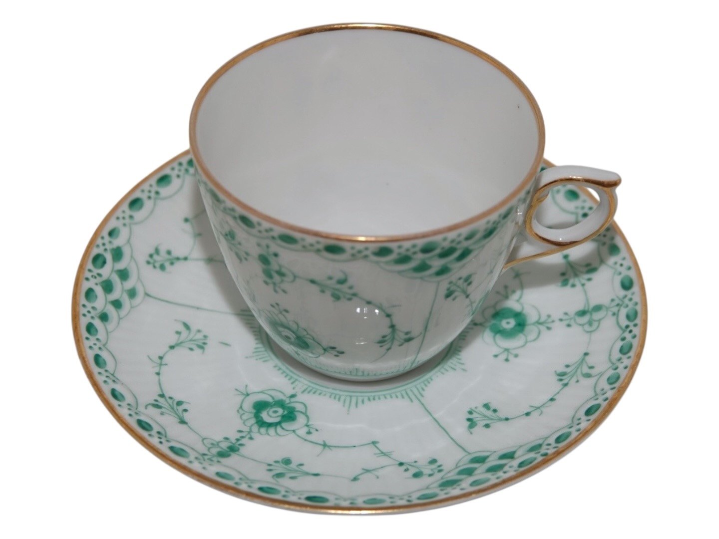 Royal Copenhagen Green Fluted Half Lace with gold trim, small coffee cup with matching saucer.It is super rare to find the early Green Fluted pieces.