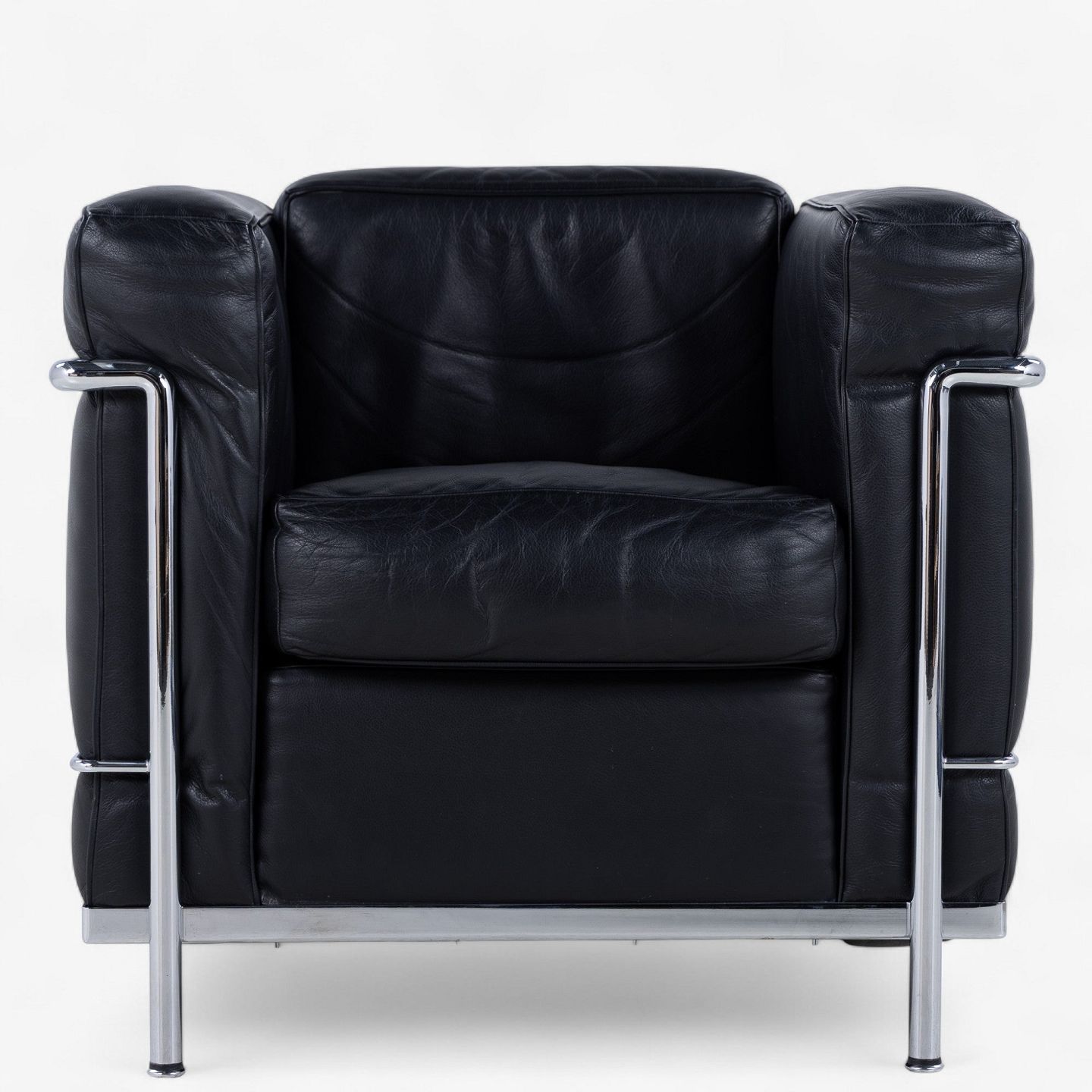 LC 2 - Lænestol i originalt sort læder med stel i stål. Stemplet fra producent.