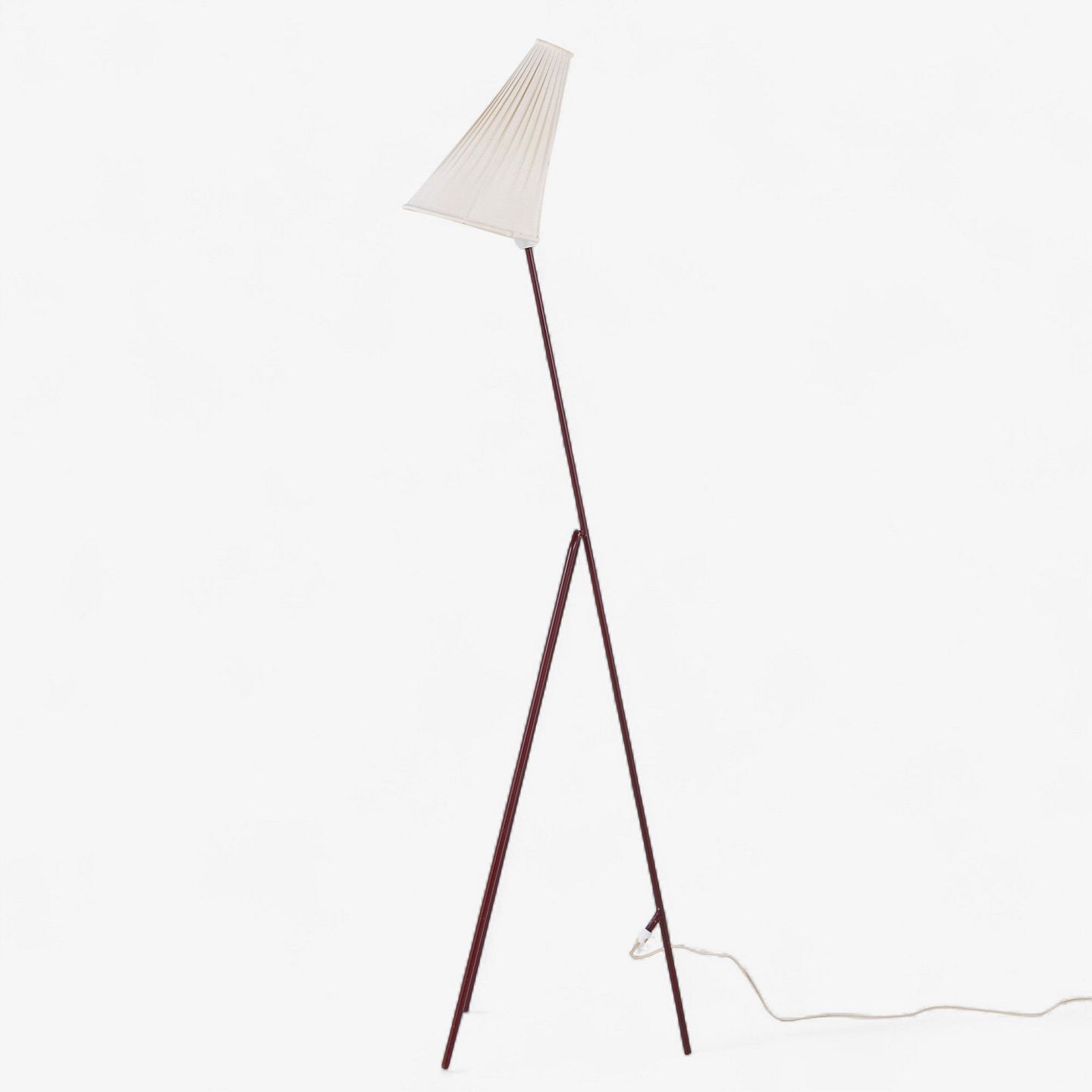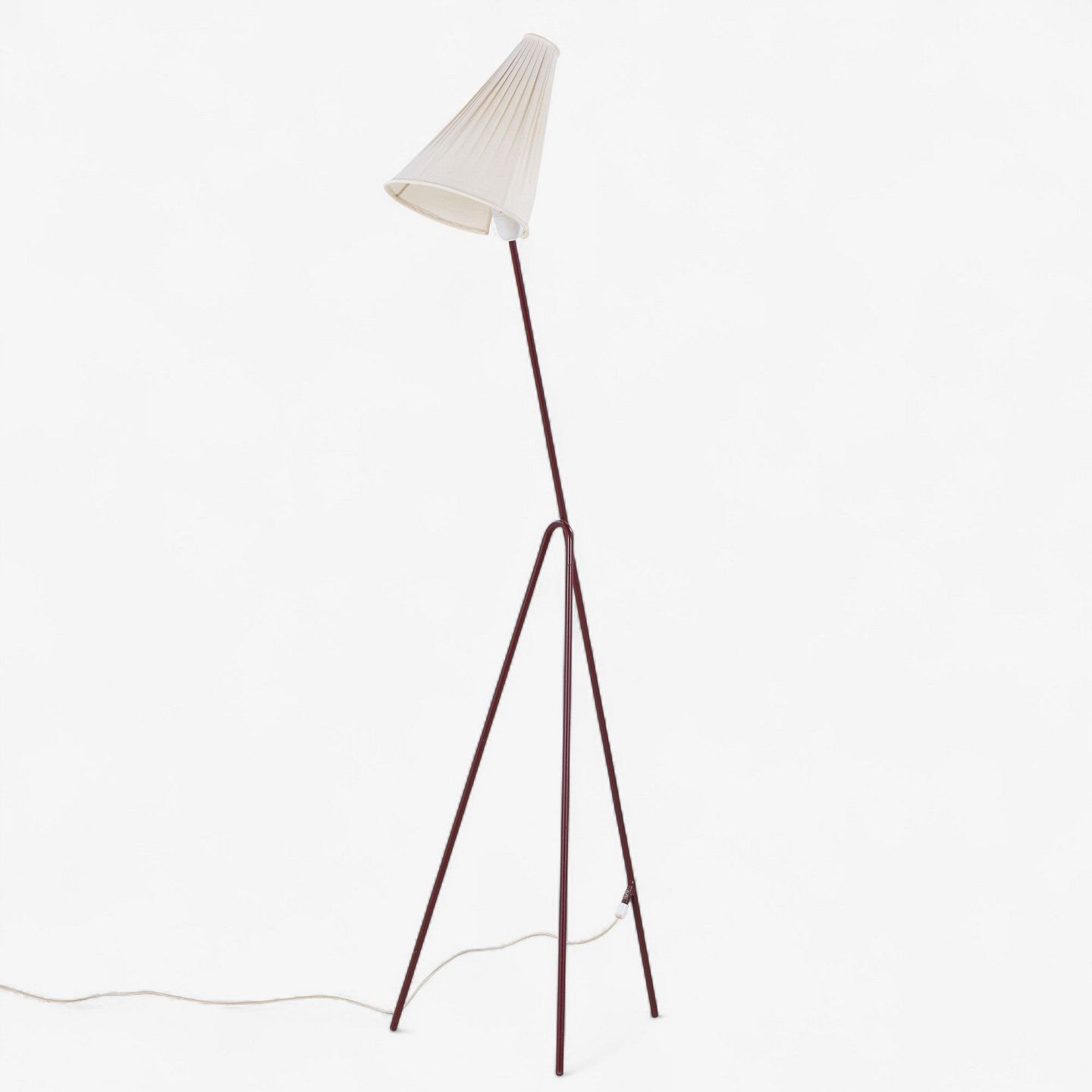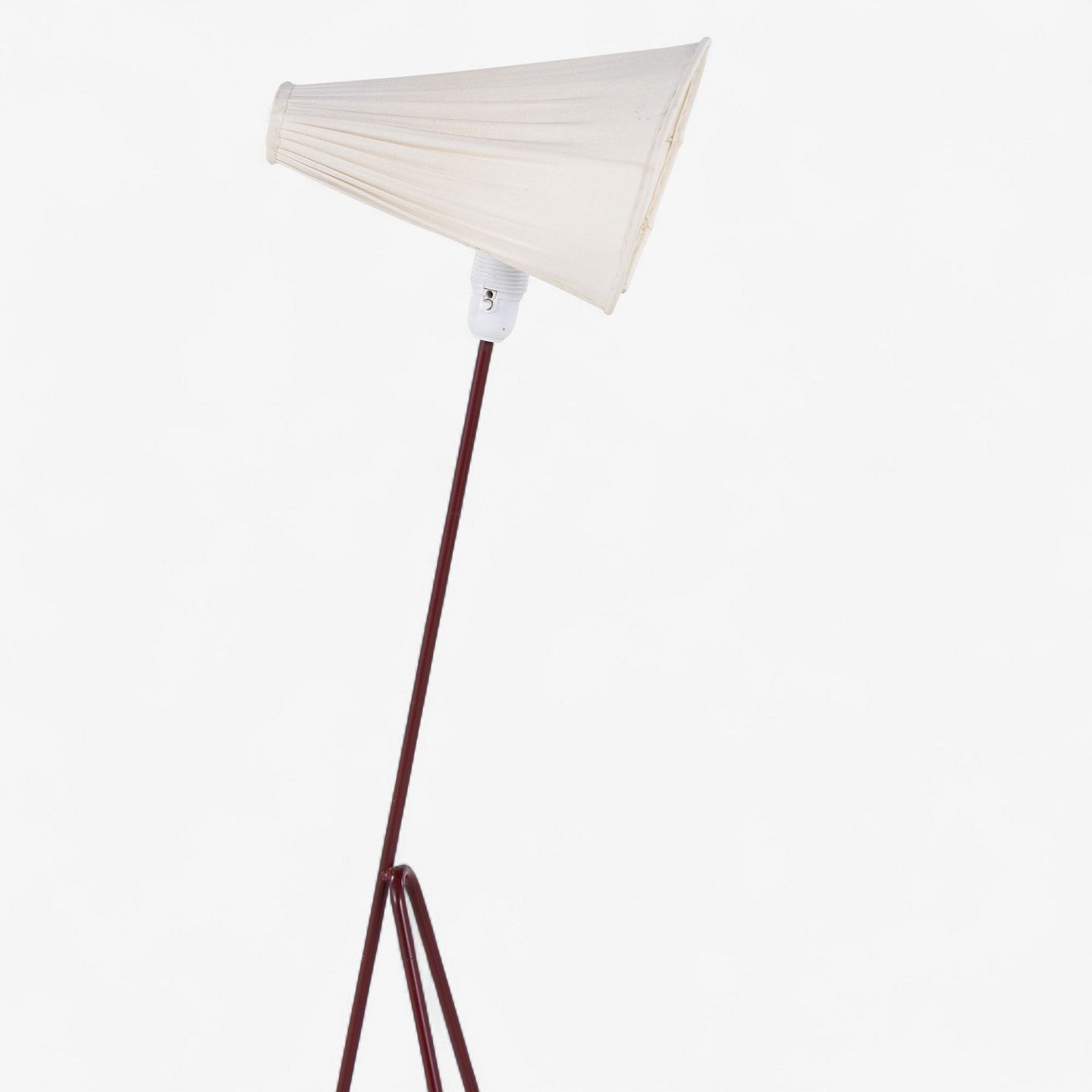 Model 569 - 'Giraffen' floor lamp with a frame in patinated red lacquered metal and a white fabric shade.