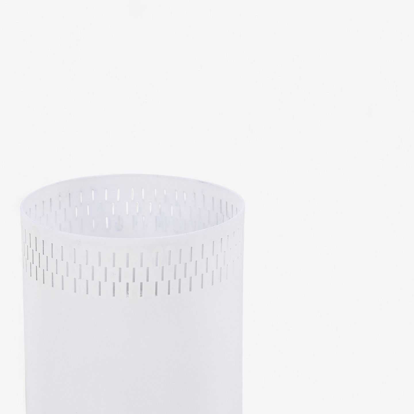 Cylindrical table lamp with a base in patinated teak and a shade in white lacquered metal.