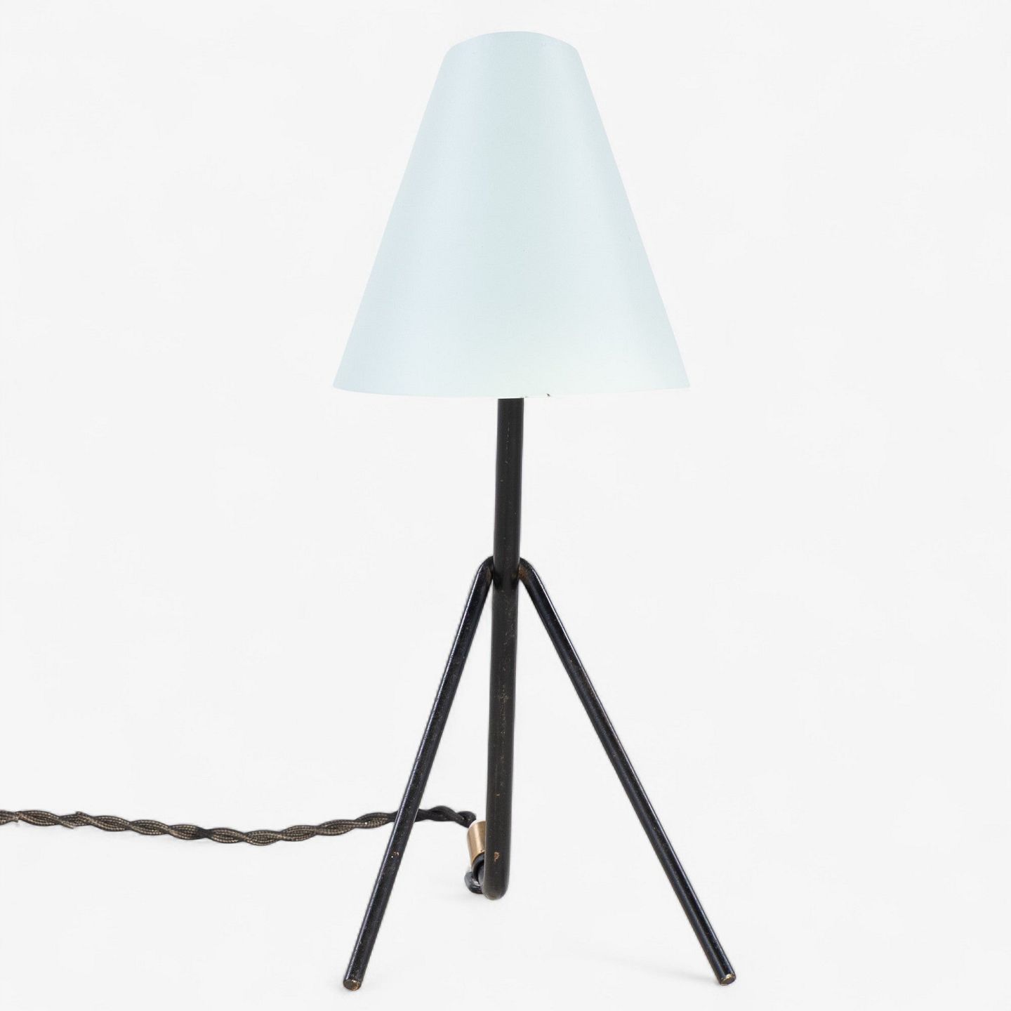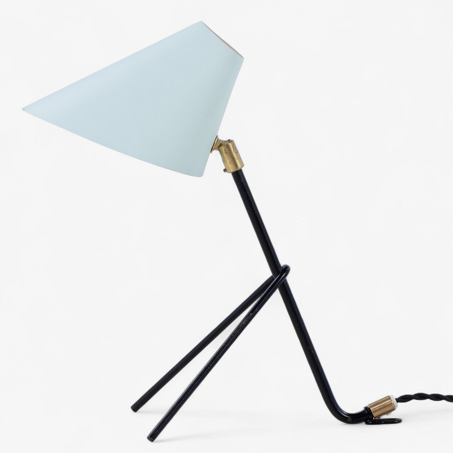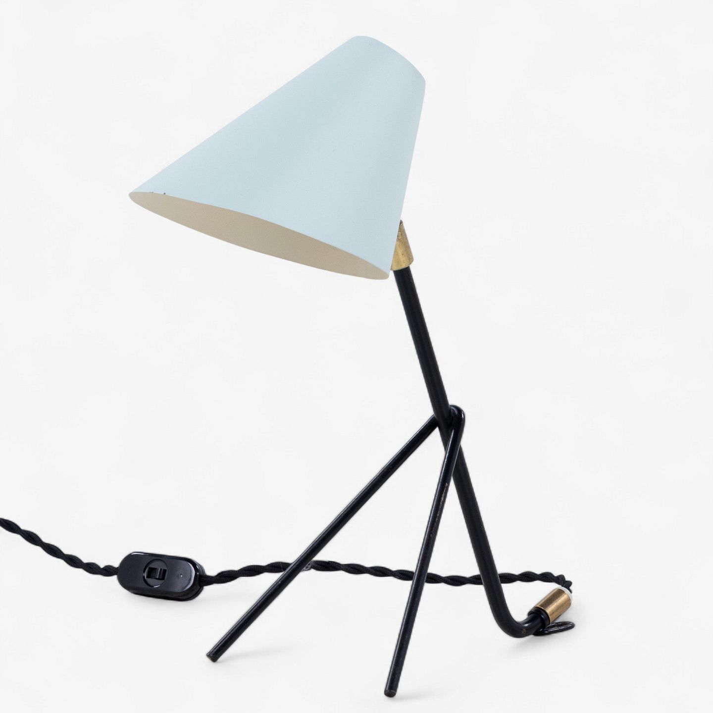 Table lamp in black lacquered metal with brass details and blue shade.