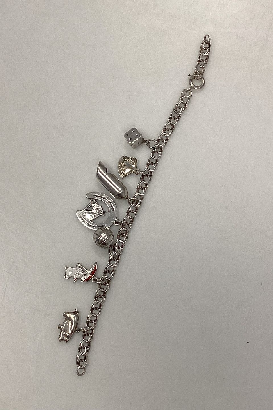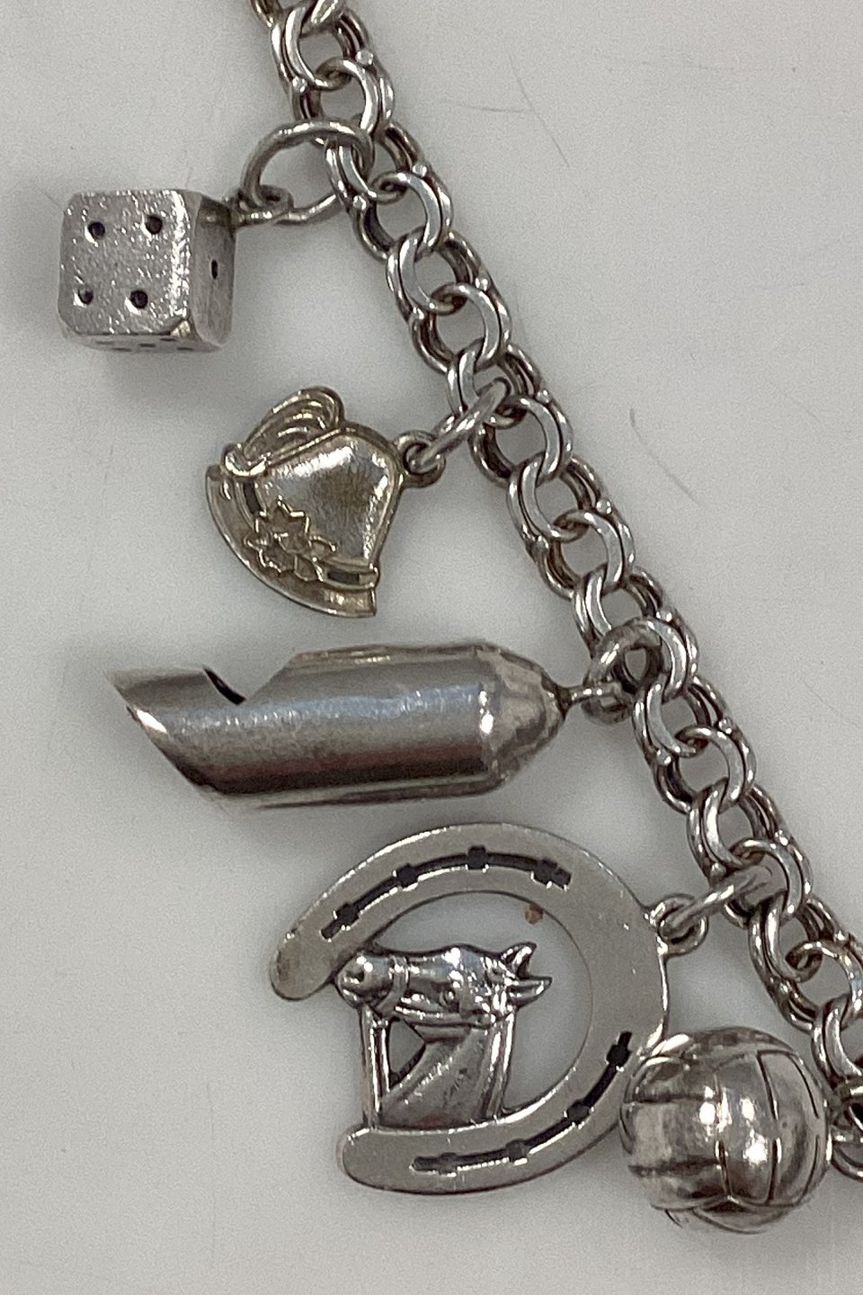 Danish Bismarck bracelet in sterling silver with various pendants, Dice, Alpine hat, Flute, Horseshoe, Ball, Girl with umbrella, and PigBy Claus Holberg Nørager