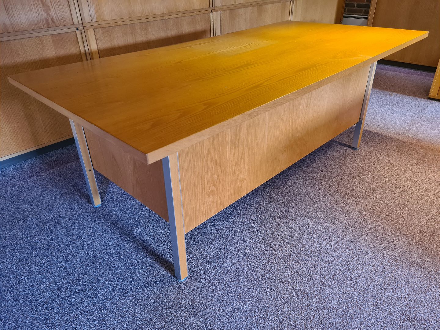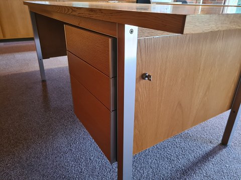 Stort Skrivebord fra 1980'erne i eg og aluminium. Fremstår pænt, velholdt og udmærket funktionsdygtigt. Dog med meget let afblegning på bordpladen efter en skrivemåtte. (Ses på billede)Højde 74 cm. Bredde 120 cm. Dybde 45 cm.