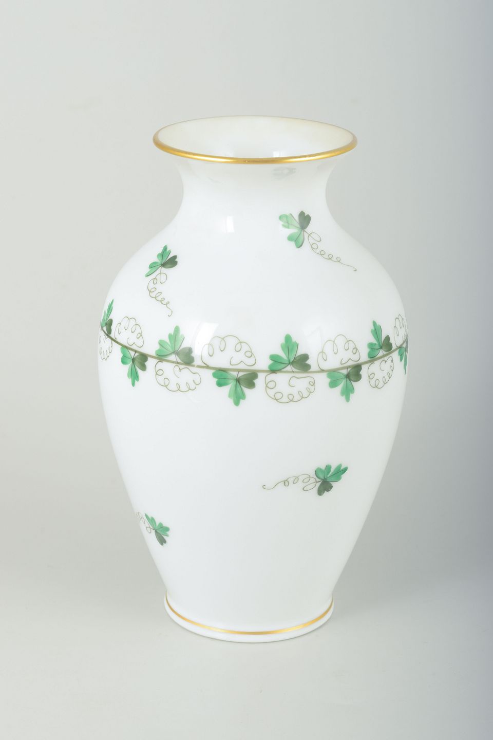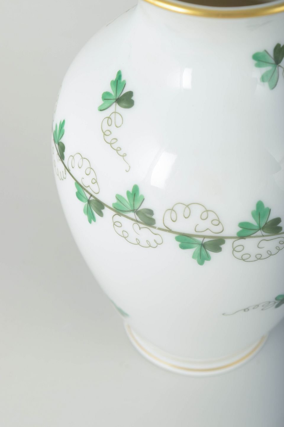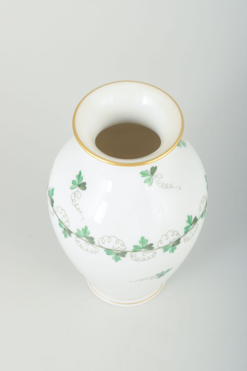 Elegant porcelain vase with hand-painted green leaf decoration and fine gilt details. Classic form with rounded body and foot, finished with a gilt rim at the opening.