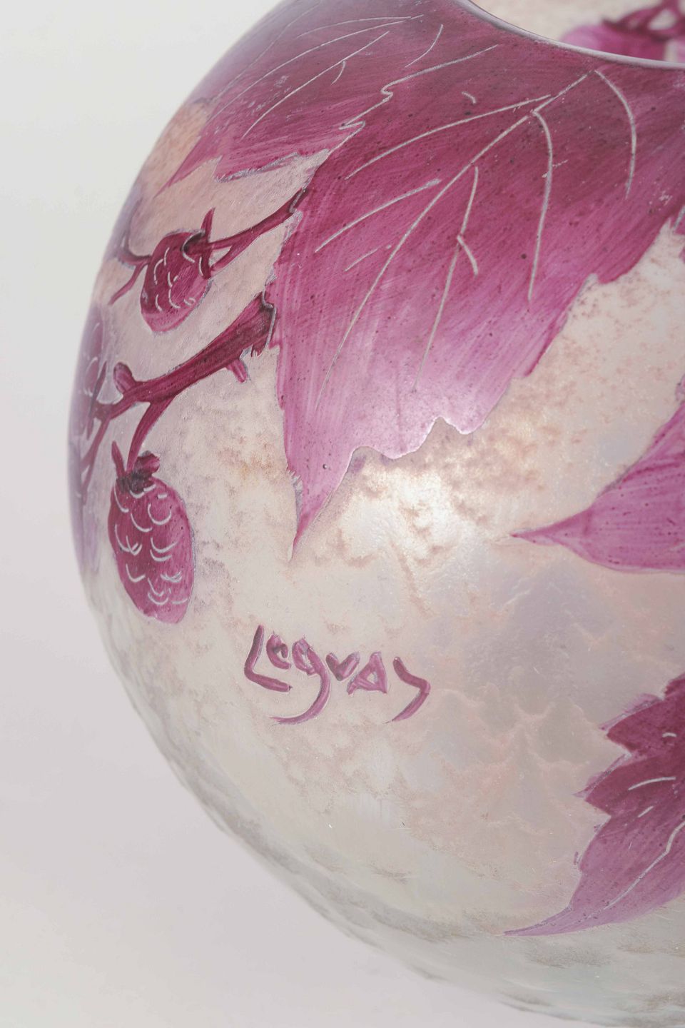 Spherical vase in frosted and opalescent glass with engraved and acid-etched decorations of leaves and flowers in purple shades. Signed “Légras” in the décor.