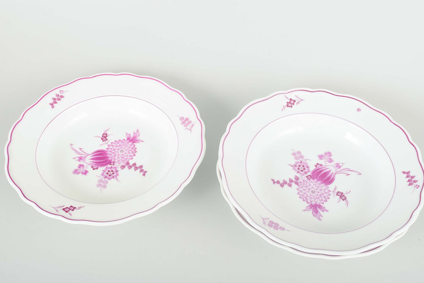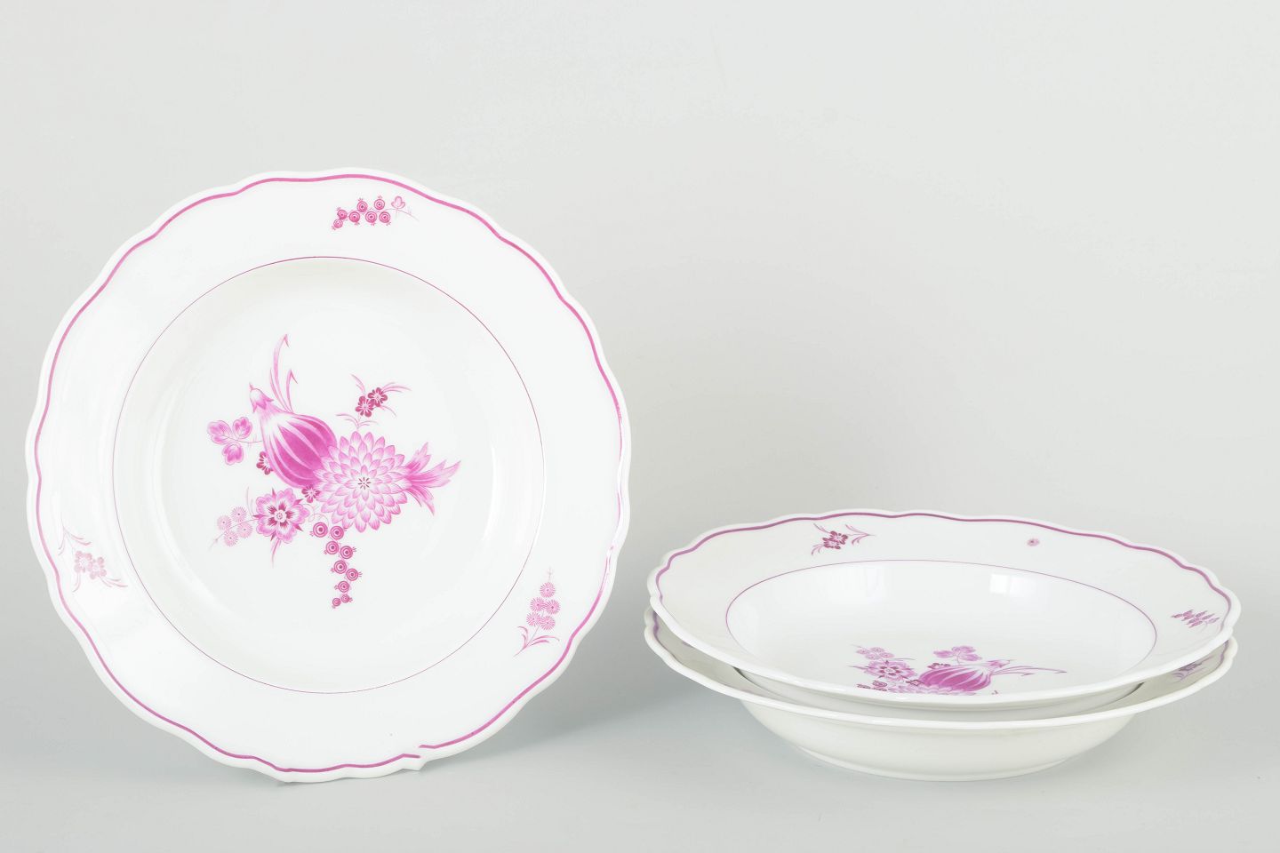 Set of three deep porcelain plates, hand-painted with floral compositions in purple/pink tones. Classic scalloped rims with simple painted detailing.