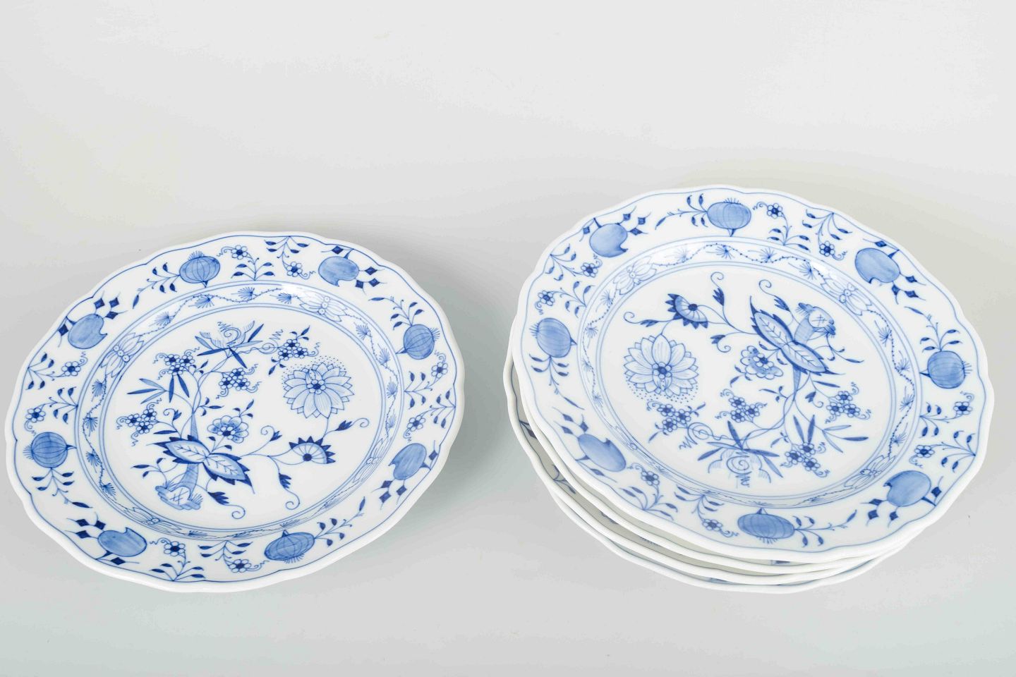 Set of six “Blue Onion” dinner plates in porcelain, hand-painted in the classic blue onion pattern (Zwiebelmuster). Cancelled with two incised lines to the underside. Excellent condition.