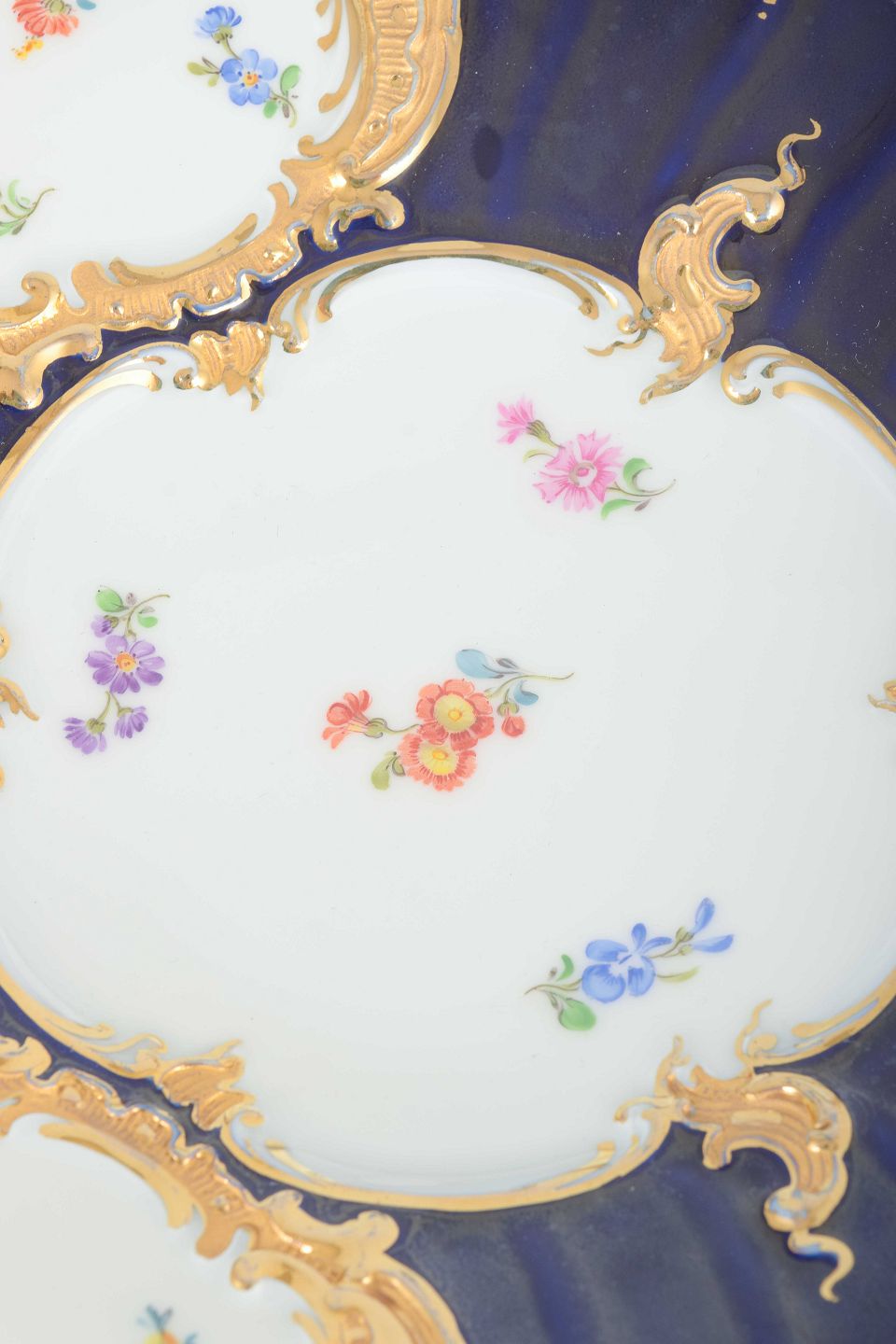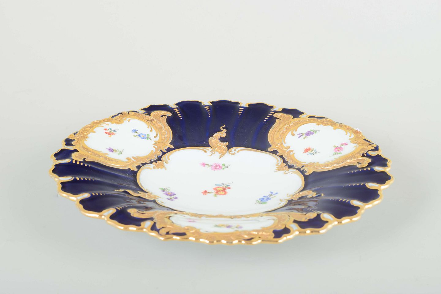 Porcelain dish with scalloped edges, cobalt blue glaze, hand-painted floral decoration, and rich gilt embellishments. First quality. Excellent condition.