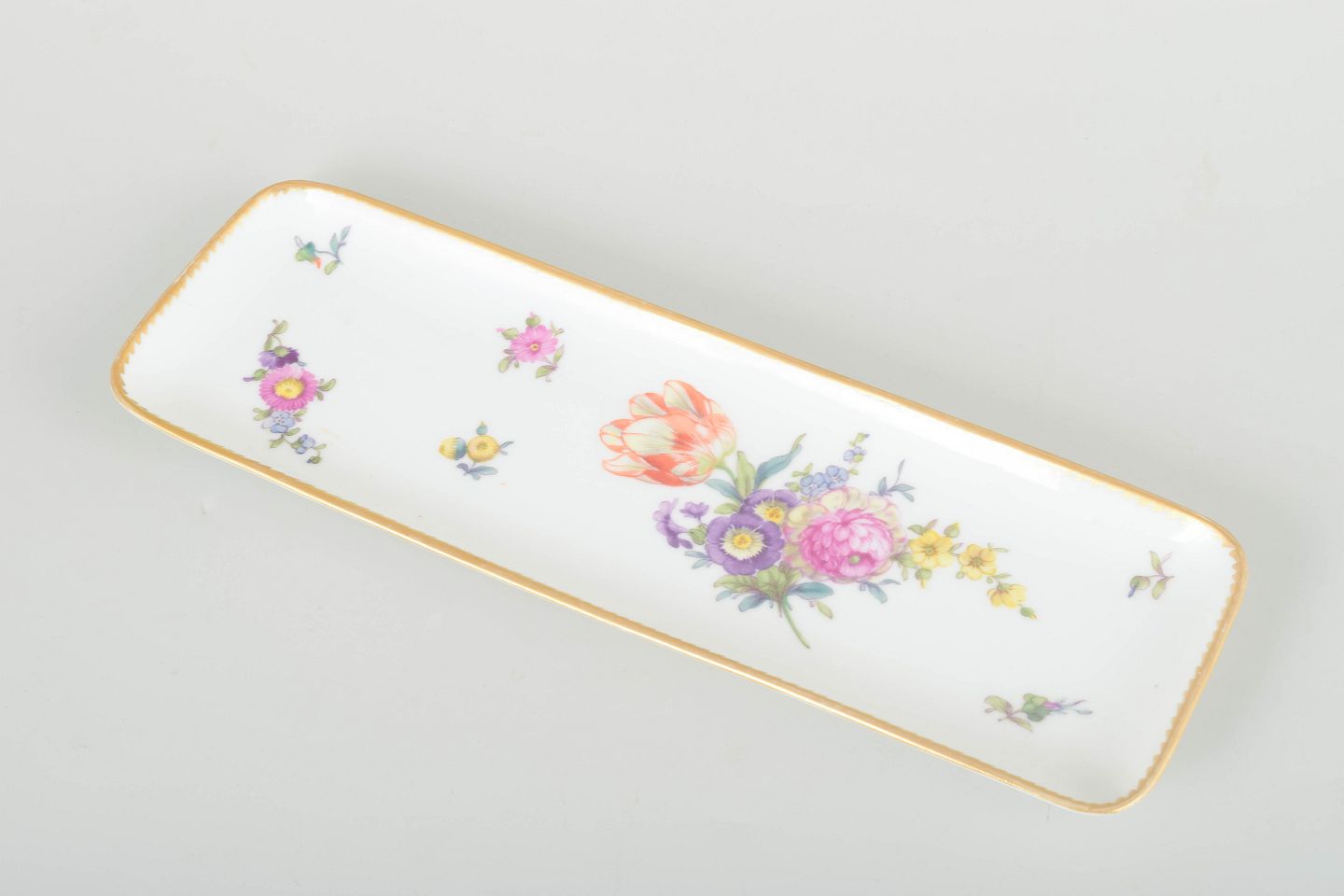 Royal Copenhagen Saxon Flower pen tray, late 19th century.Antique rectangular porcelain pen tray decorated with hand-painted flowers in the classic “Saxon Flower” pattern and gilded rim.