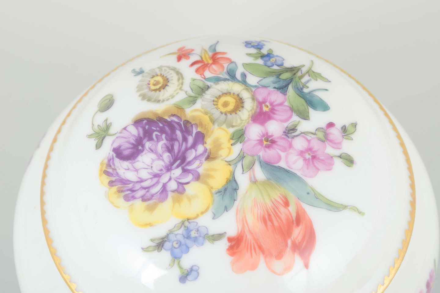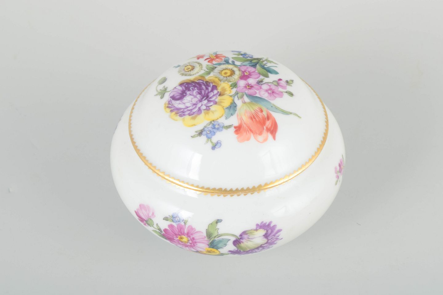 Elegant round porcelain jar with lid, decorated with hand-painted flowers in the classic “Saxon Flower” pattern and gilded rim.