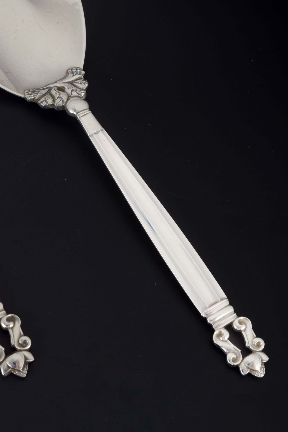 Elegant large salad set consisting of a salad spoon and a salad fork in the classic “Acorn / Konge” pattern, designed by Johan Rohde in 1915. The handles are decorated with the characteristic acanthus leaf and acorn motif.