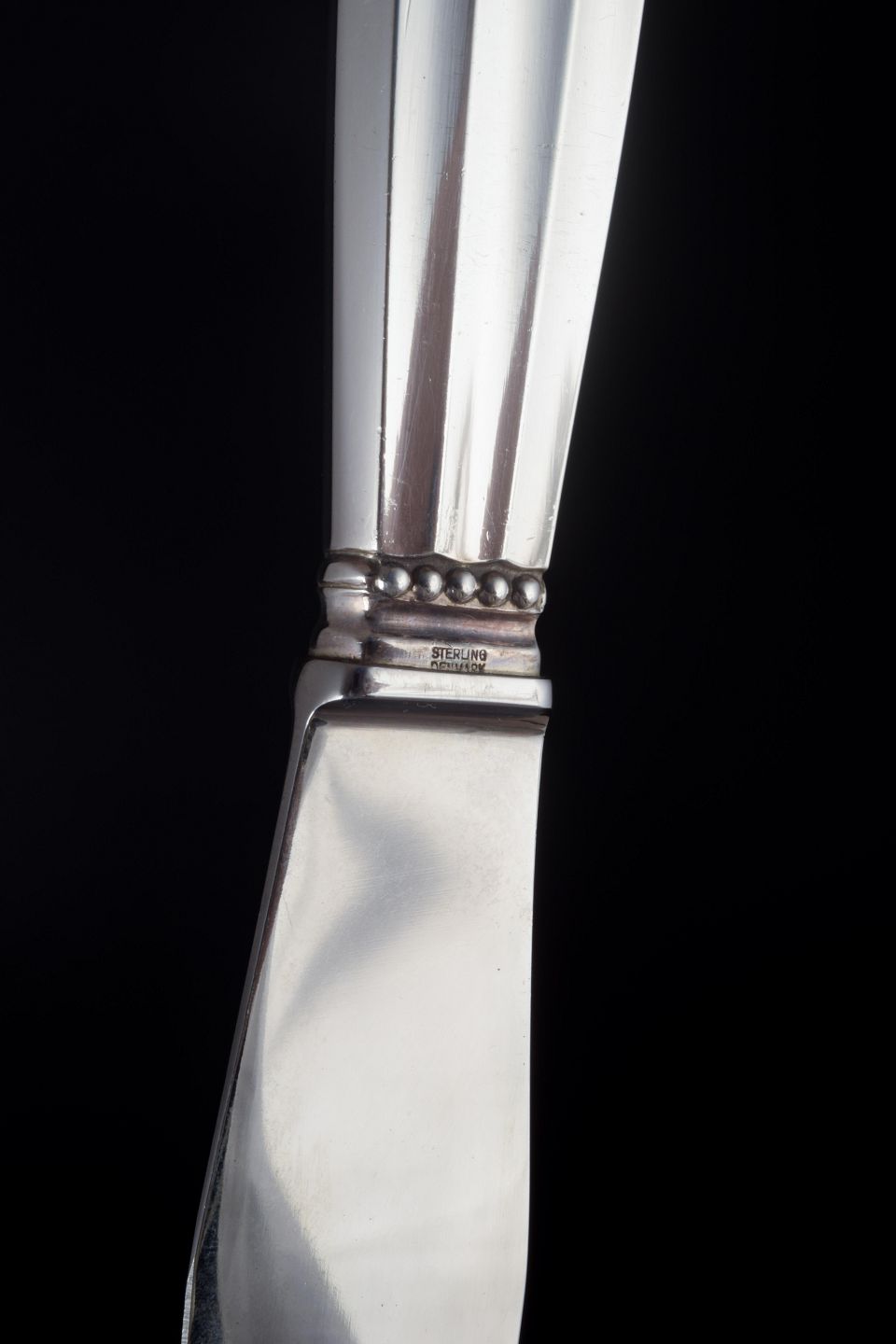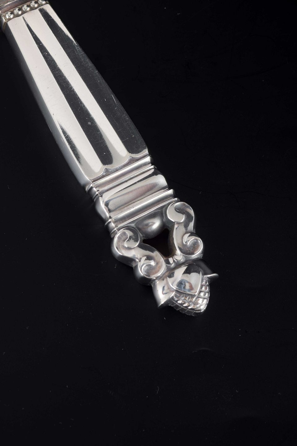 Elegant long dinner knife in the classic “Acorn / Konge” pattern, designed by Johan Rohde in 1915. The handle is crafted in sterling silver, while the blade is stainless steel.