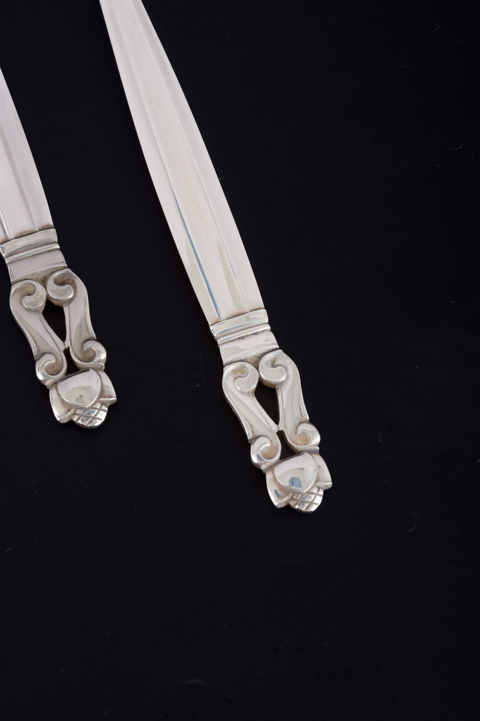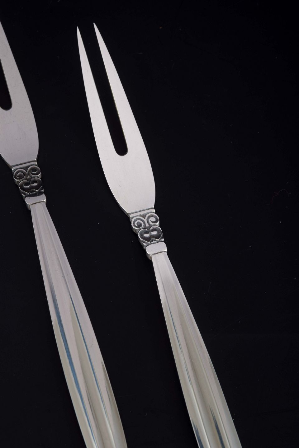 Elegant cold meat forks in the classic “Acorn / Konge” pattern, designed by Johan Rohde in 1915. Decorated with the characteristic acanthus leaf and acorn motif.