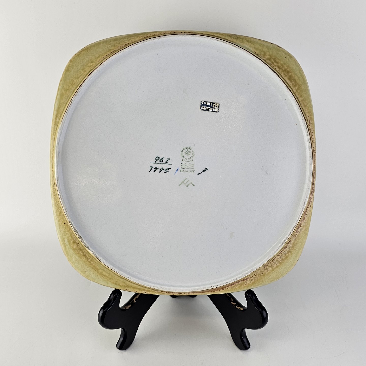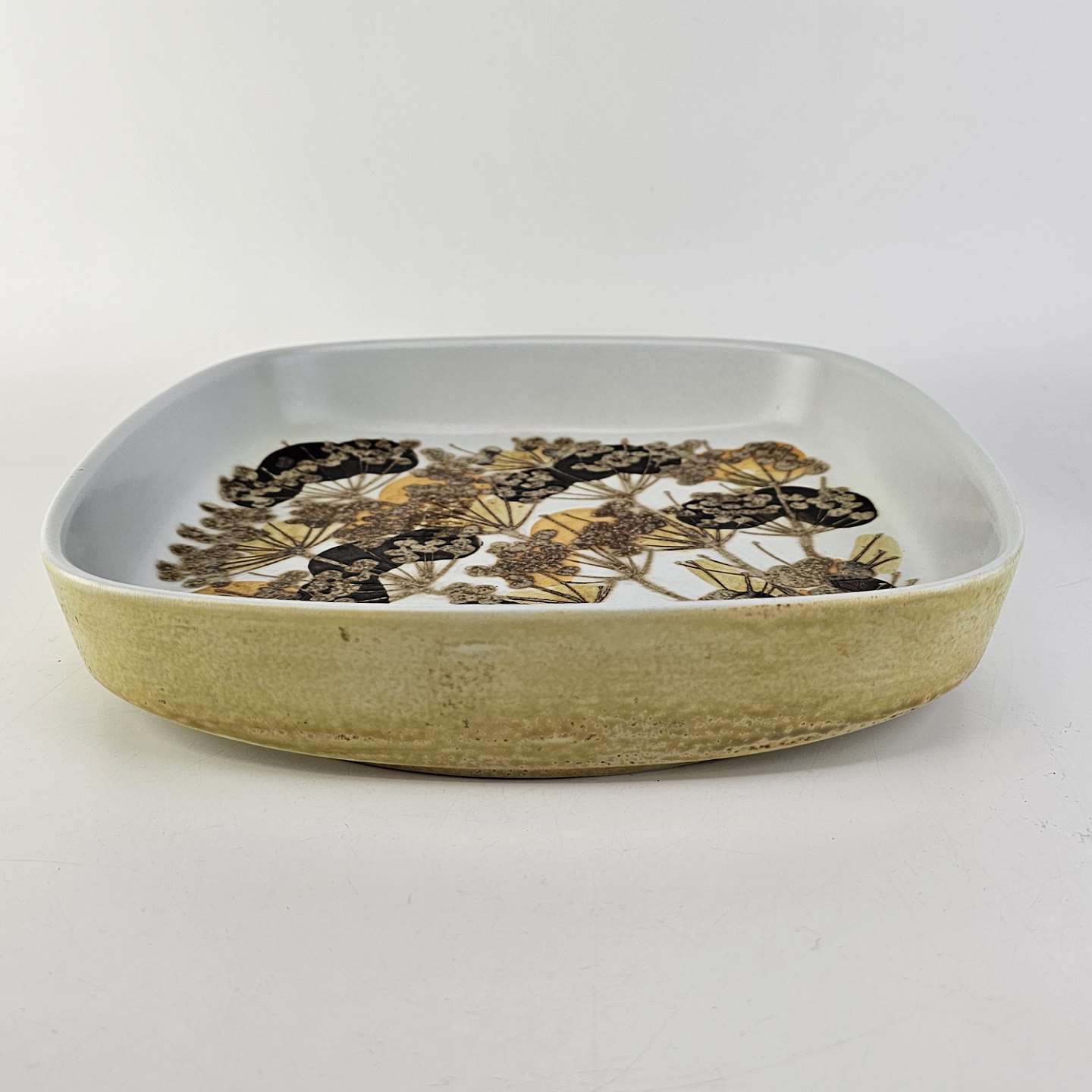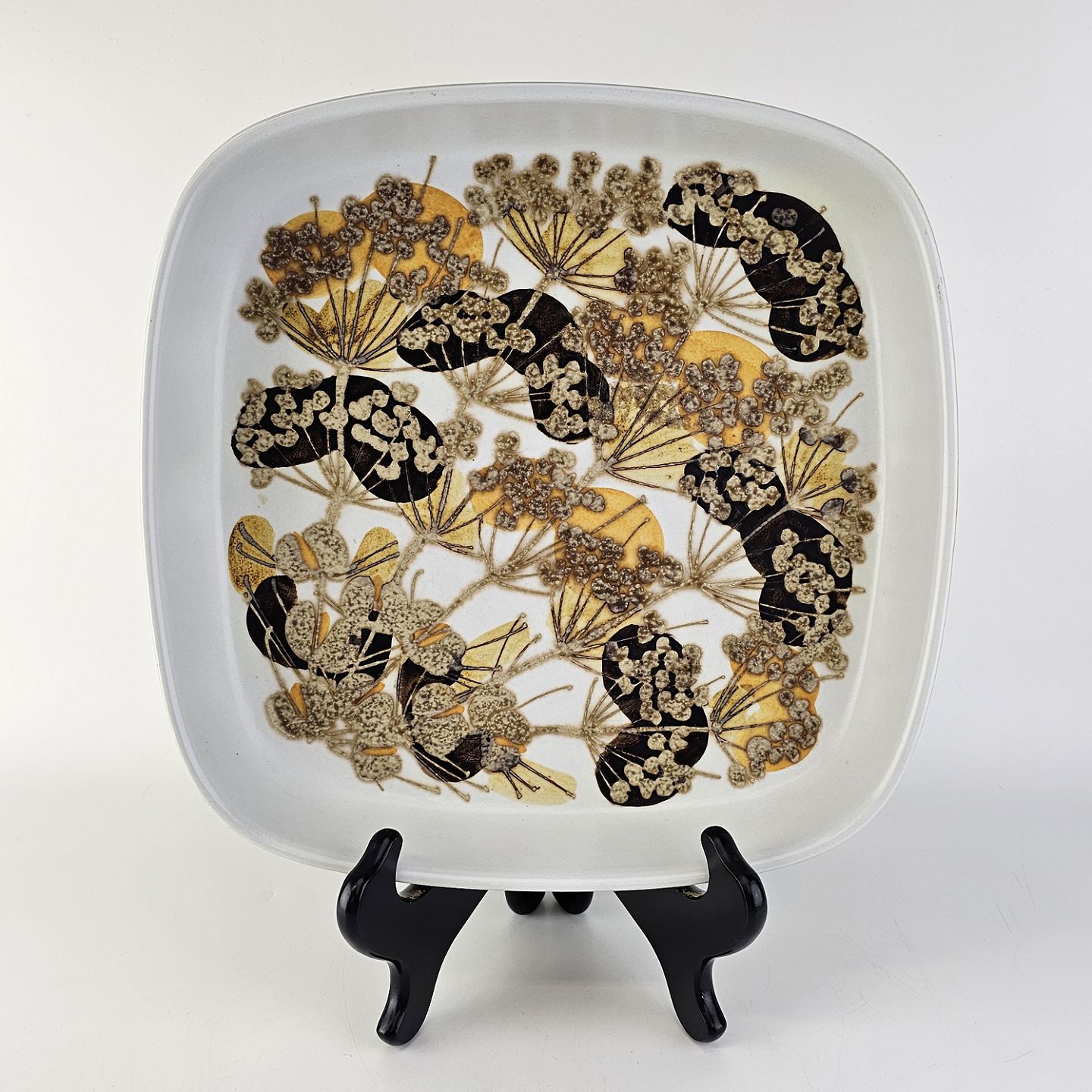 Firkantet fad i hvid fajance fra serien Baca med abstrakt blomstermotiv i brune, sorte og gyldne nuancerNr. 962/3775