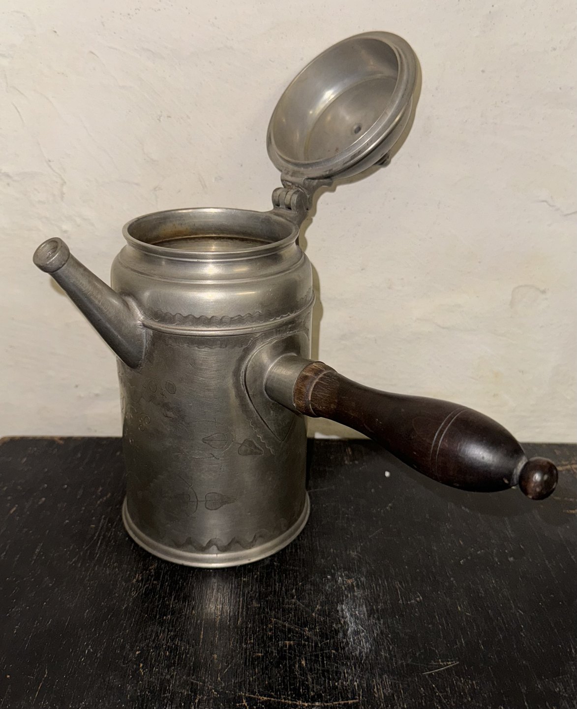 Coffee pot made In Pewter With lid and wooden handle. Engraved decoration on the front showing the owner's initials and the year 1864. In good condition. Stamped inside the base (indistinct). H. 21.5 cm Dealer