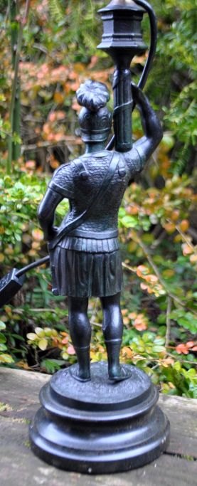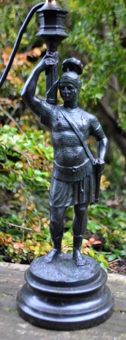 Table lamp in the shape of a standing Roman soldier, 19th century. Germany. Cast metal. Green marble base. H.: 38 cm. Height with electric fitting: 57 cm.Perfect condition!