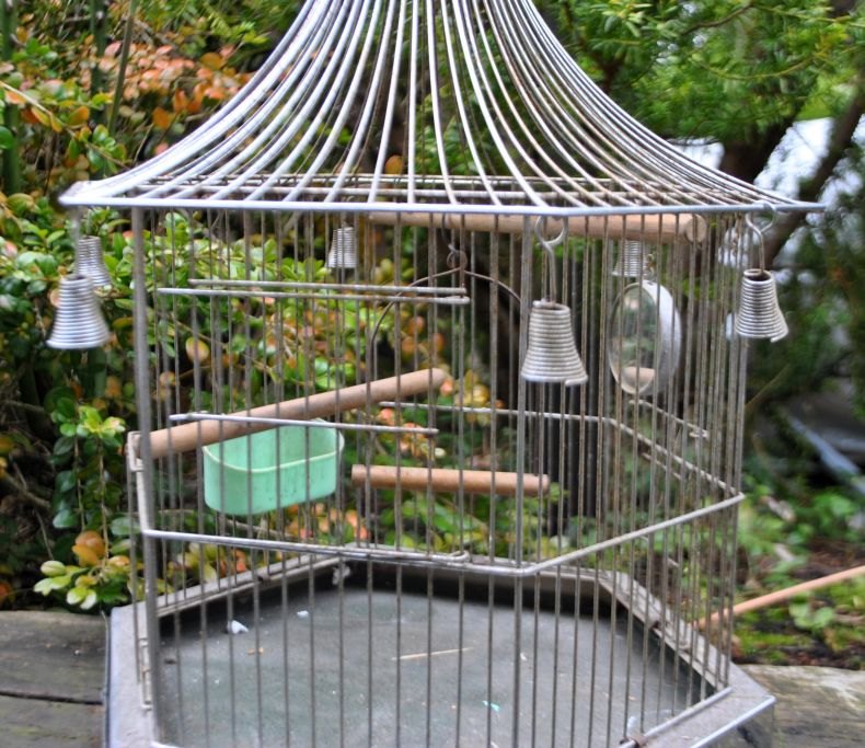 Hexagonal birdcage in metal, 20th century. With a door, two sliding doors, two wooden pegs, mirror, swing and food trough. Bottom can be pulled out as a drawer for cleaning. Incl. hook for hanging. H: 45 cm. W: 34 cm.Item number: 28426