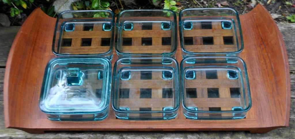 Teak cabaret dish with six glasses, Jens H. Quistgaard. 2nd grade. Stamped JHQ Denmark. One of the glass dishes has a matching lid. L: 45 cm. W: 25.5 cm.Item number: 28427