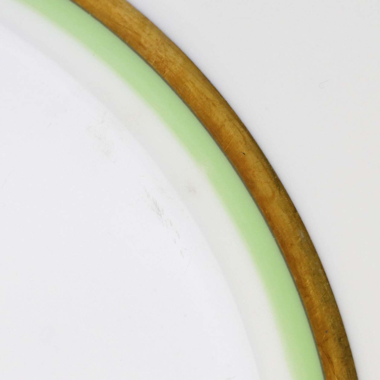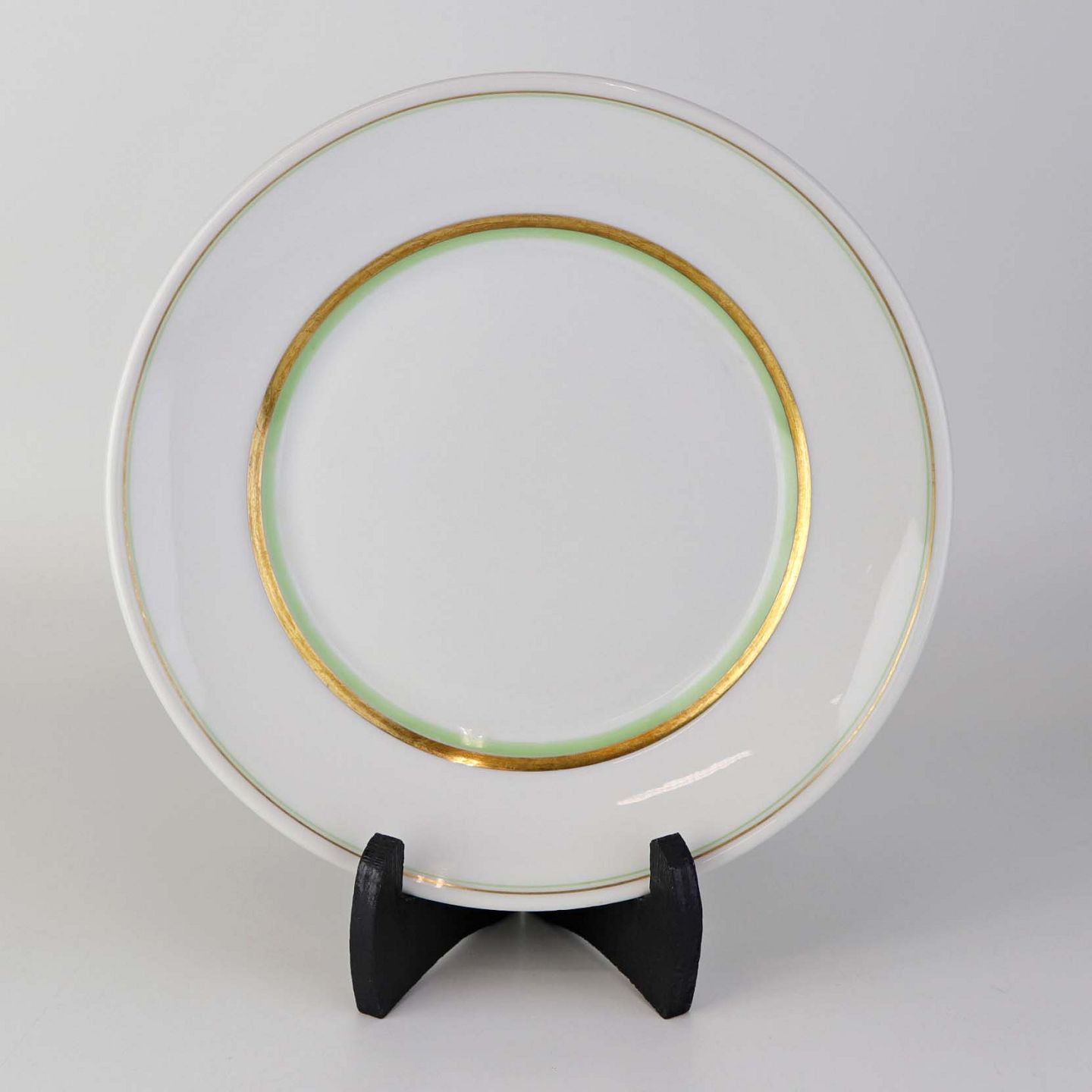 Service i glat hvidt porcelæn med dekoration i grøn og gylden streg.