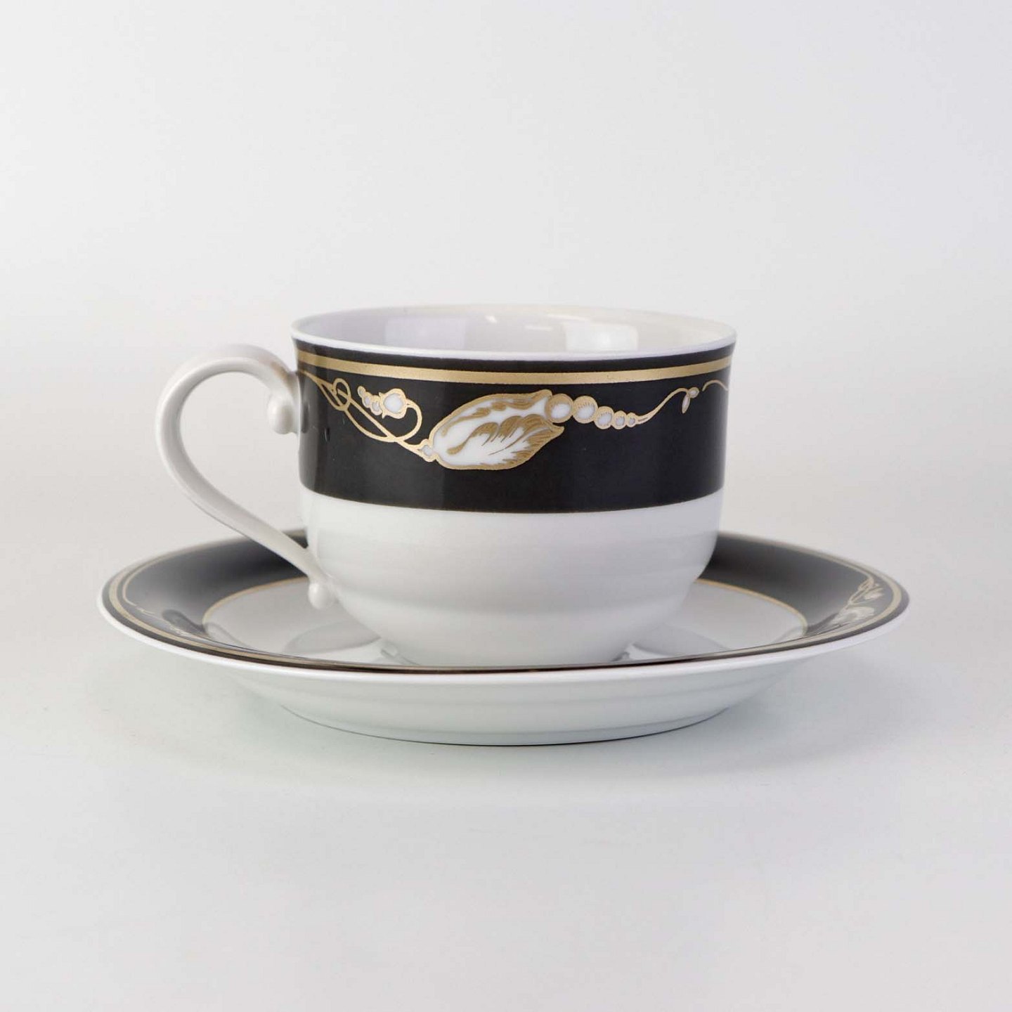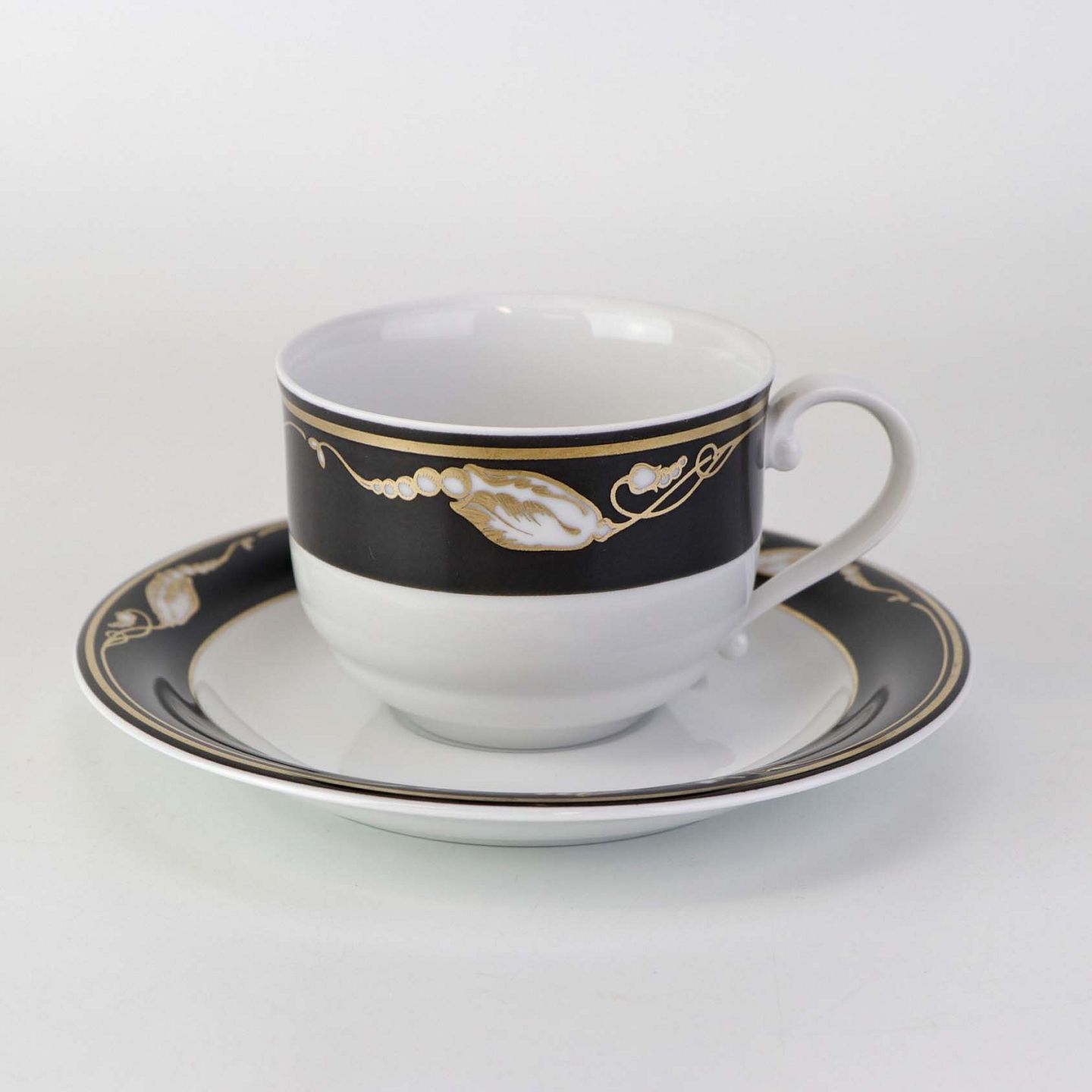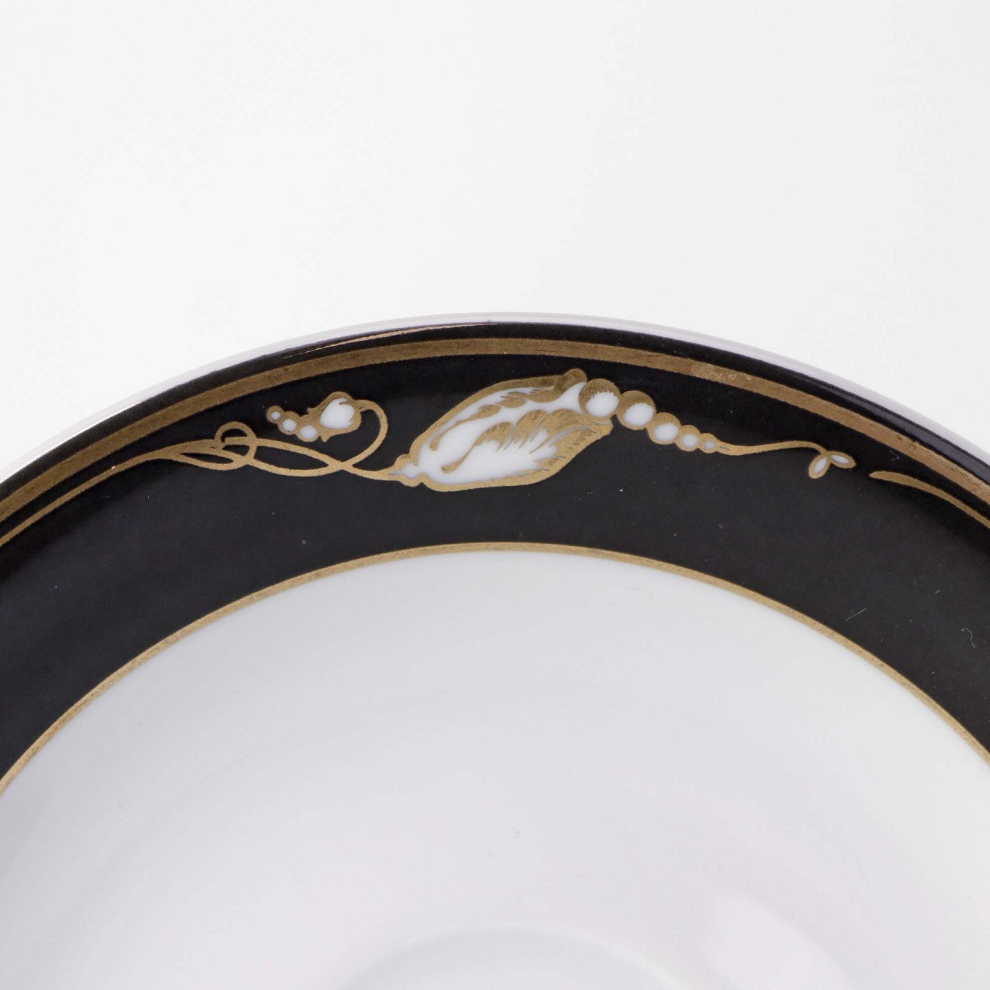 Service i glat hvidt porcelæn dekoreret med sort bort og gylden blomsterknop.