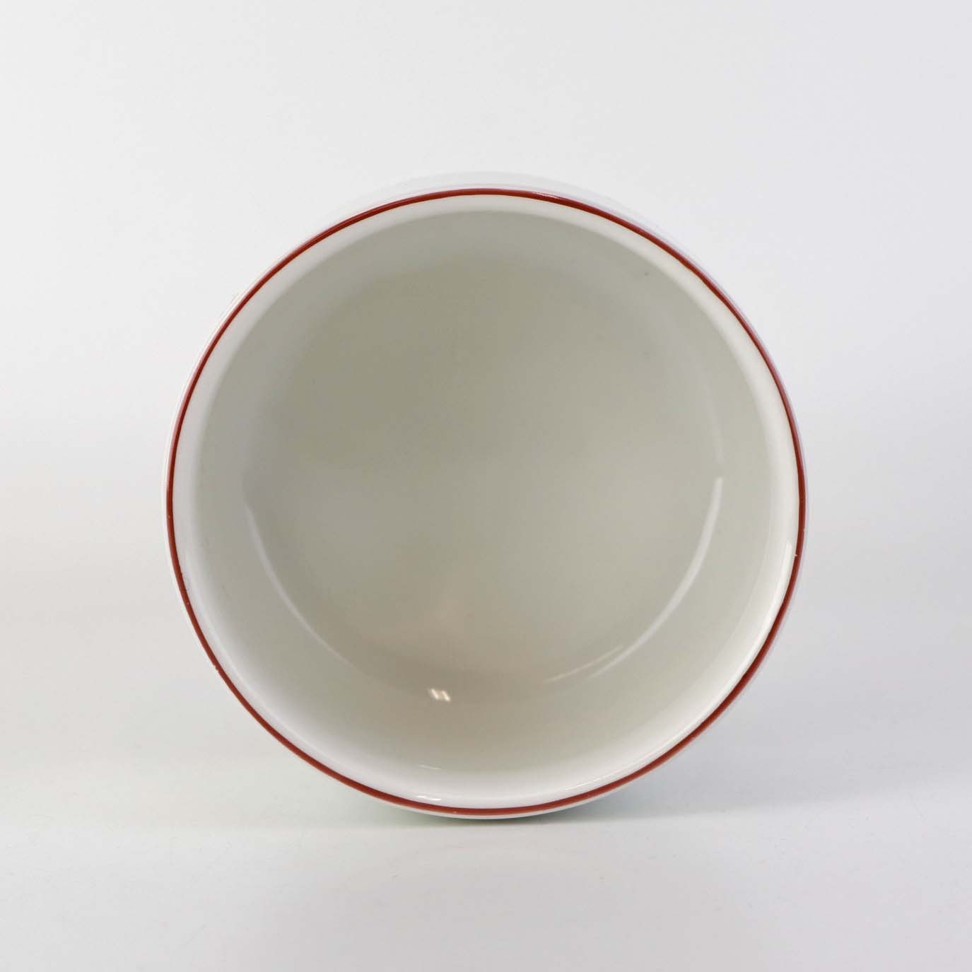 Service i glat hvidt porcelæn med dekoration i tynd rød streg.
