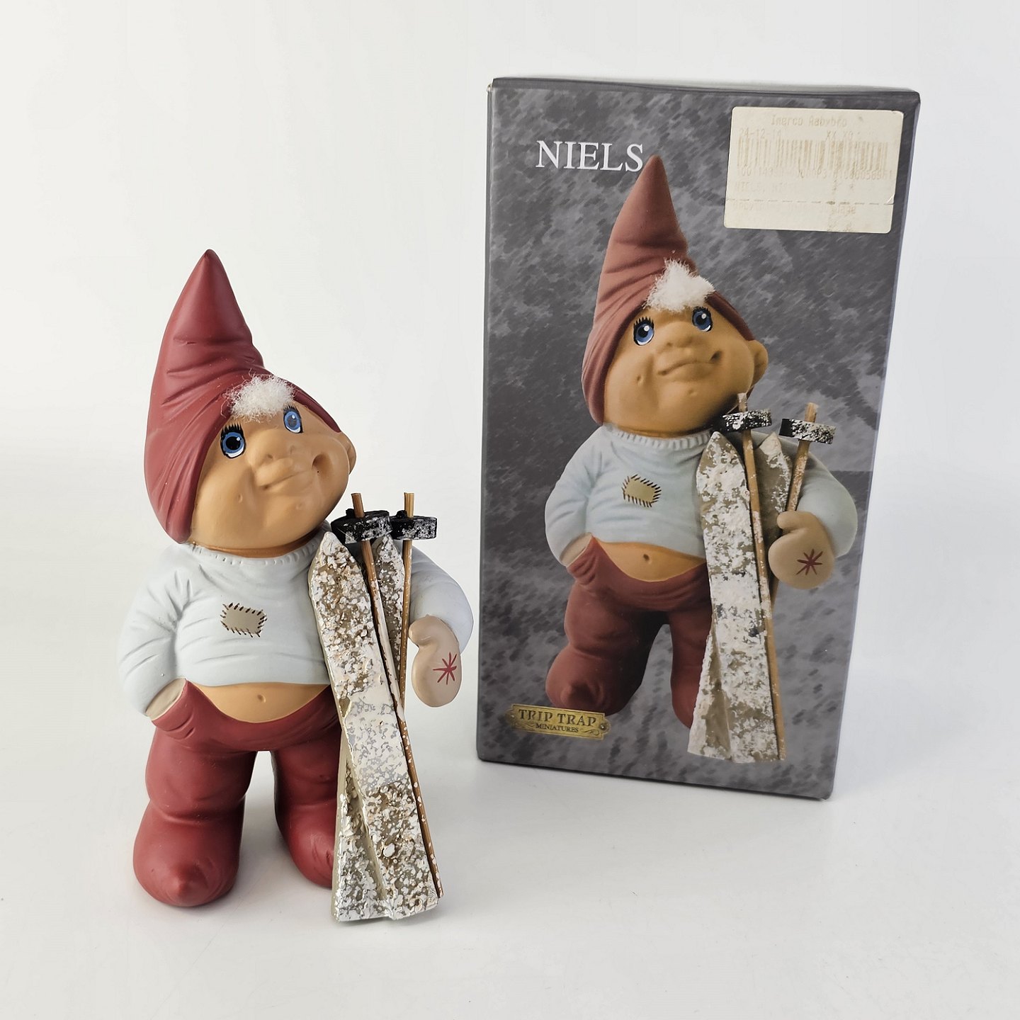 Figurer med motiv af nisserne Bette Inger, Bette Knud og Niels med skiNiels kommer i original kasse