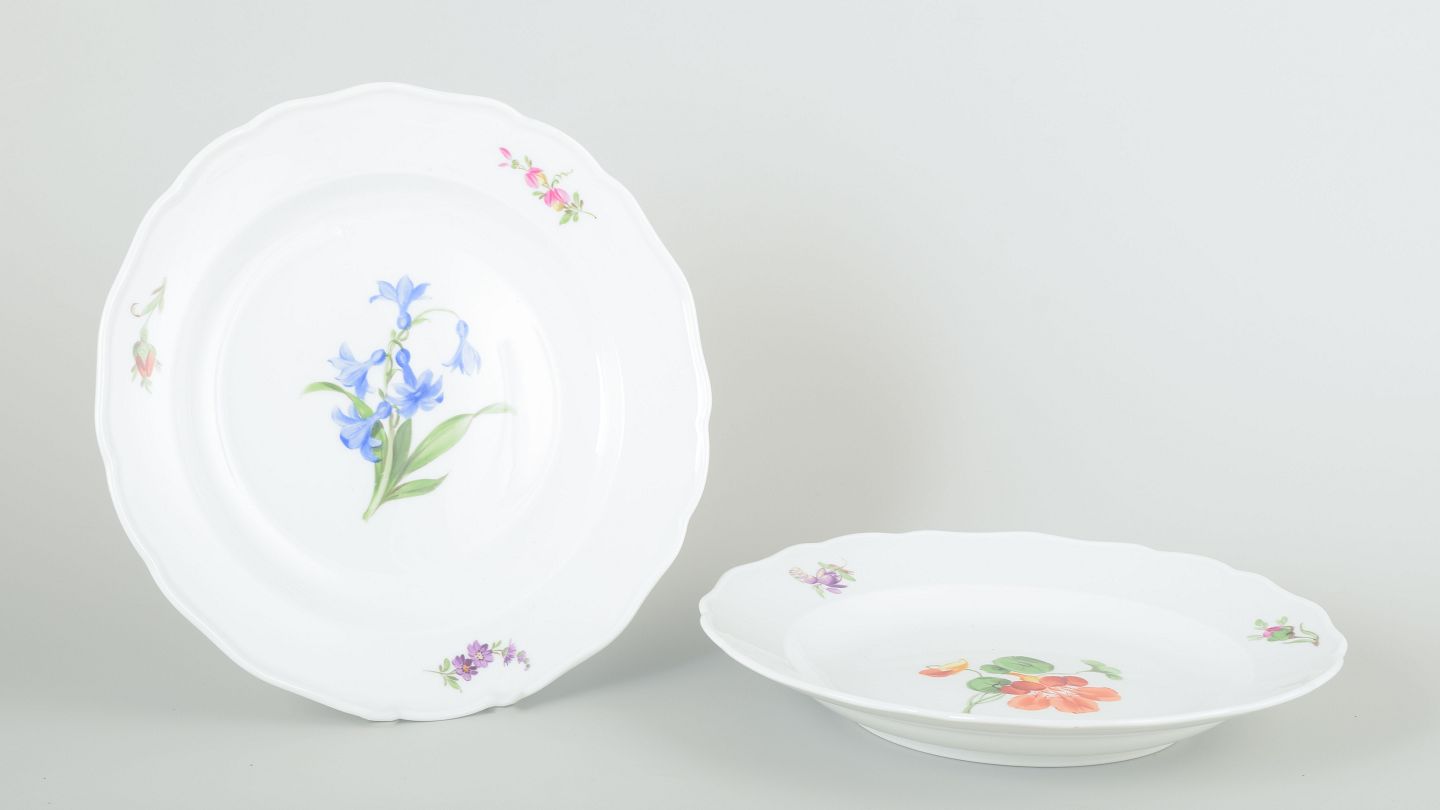 Two porcelain plates, hand-painted with multicoloured floral decorations. Classic scalloped rim with relief and delicate detailing.