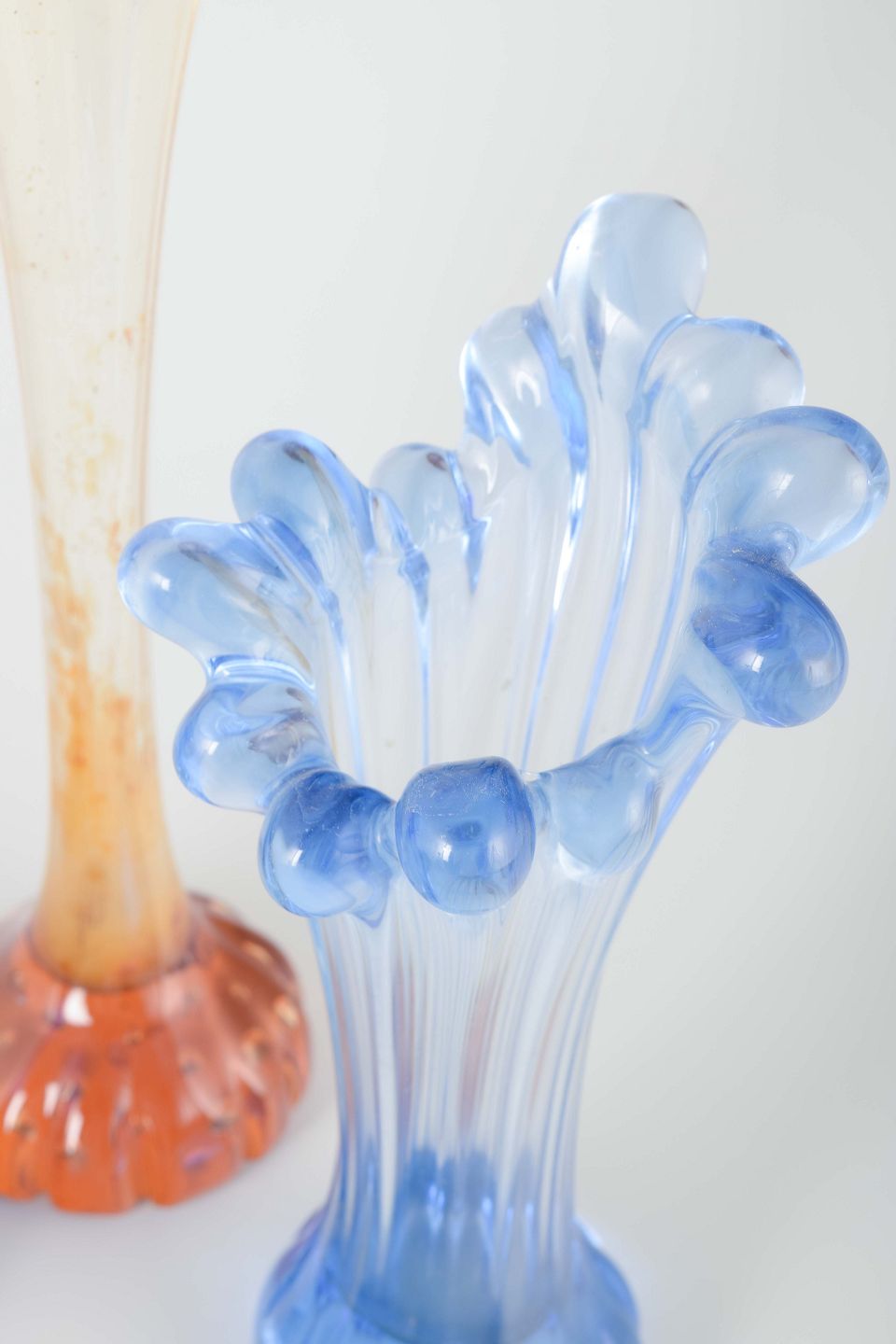 Organic freeform vases in blue and pink tones, with fluid shapes typical of Swedish studio glass from the 1970s, where colour and form were used expressively and sculpturally.