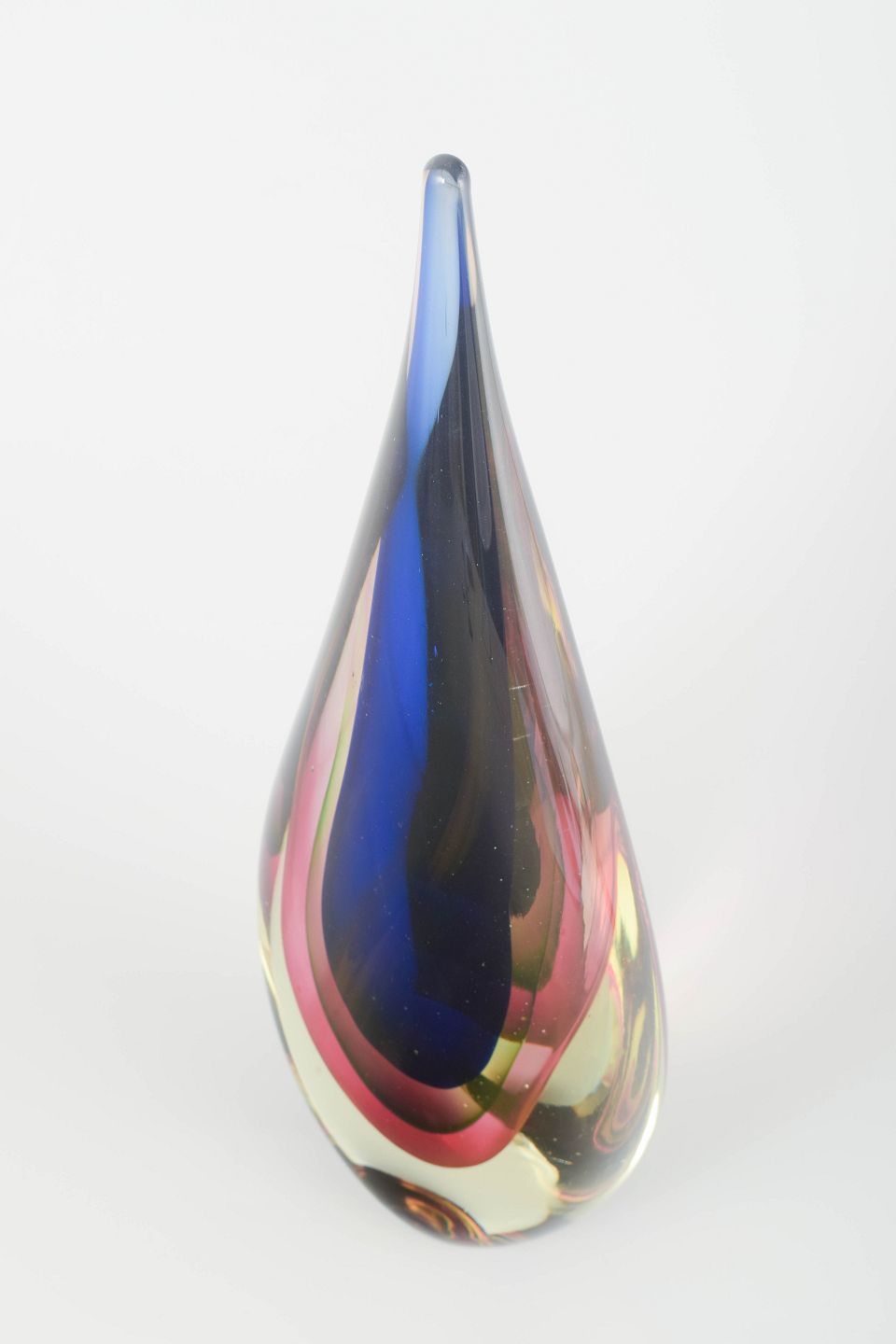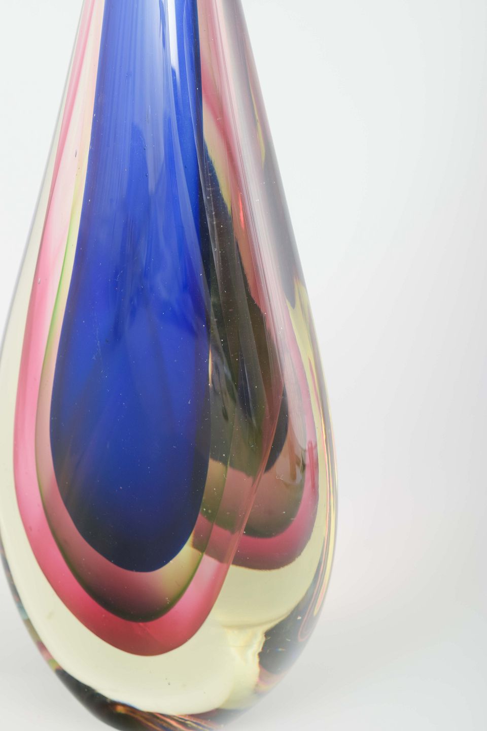 Organic teardrop form in solid glass with layered hues of blue, pink, amber and clear tones. A fine example of the Italian sommerso technique, where several layers of coloured glass are fused within a clear outer layer.