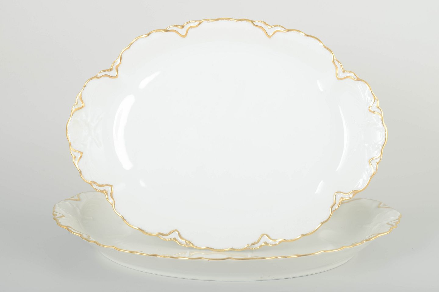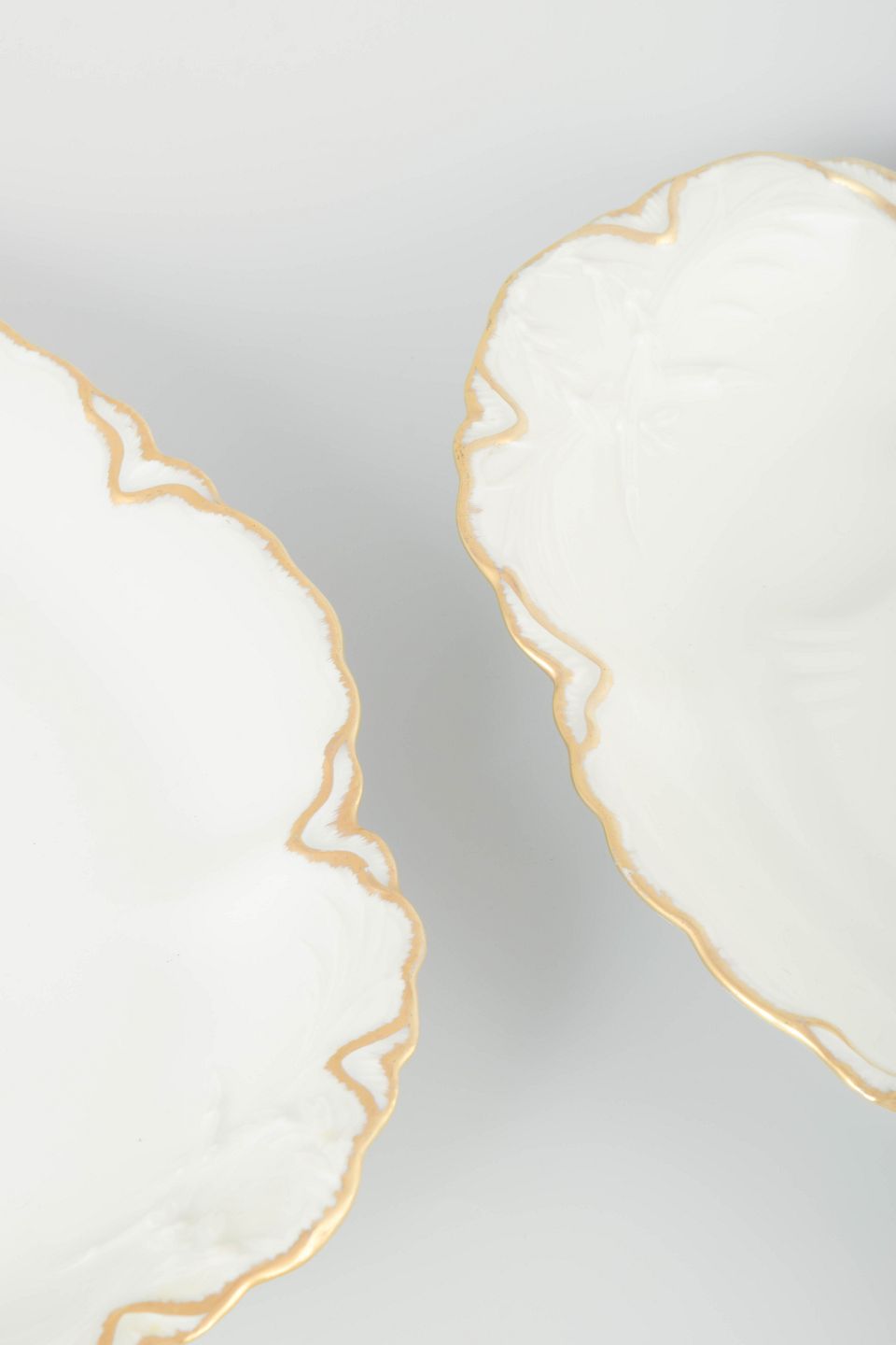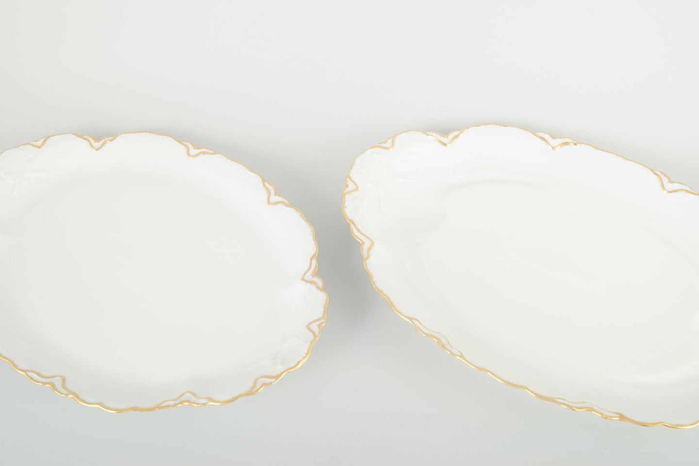 2 oval dishes, 1940s.Elegant pair of oval porcelain dishes in a warm cream tone with hand-painted gold edging and gently scalloped forms. A fine example of classic French tableware with subtle Art Deco influence.