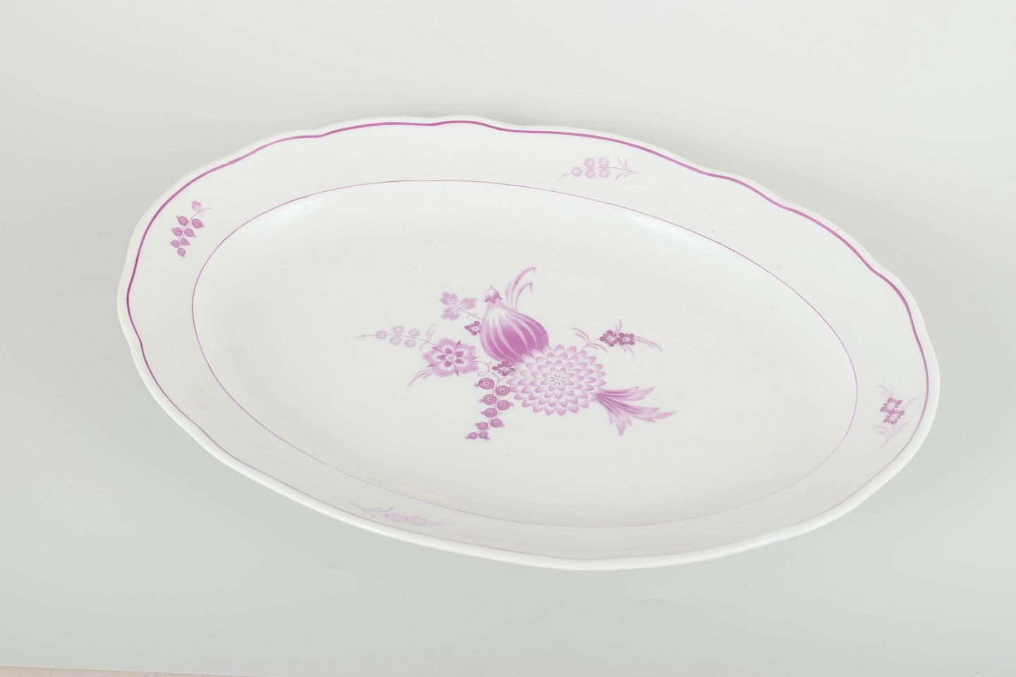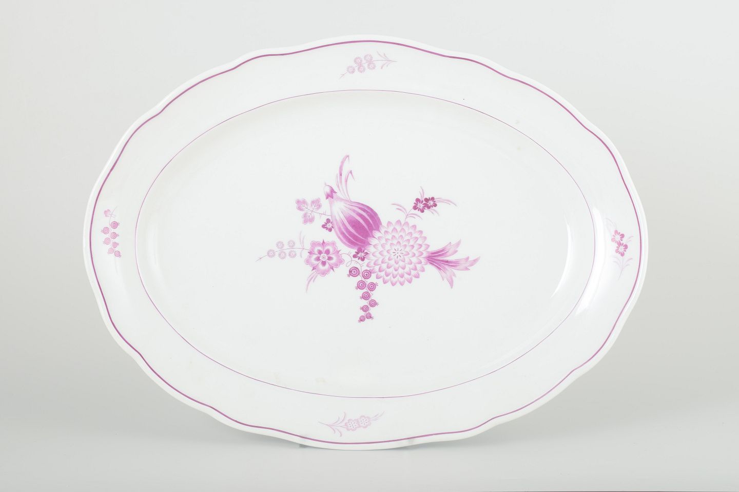 Large hand-painted oval porcelain serving dish decorated with lilac floral compositions and a gently scalloped rim. Classic Meissen design with delicate pink-lilac detailing, ideal for serving or as a decorative centrepiece.