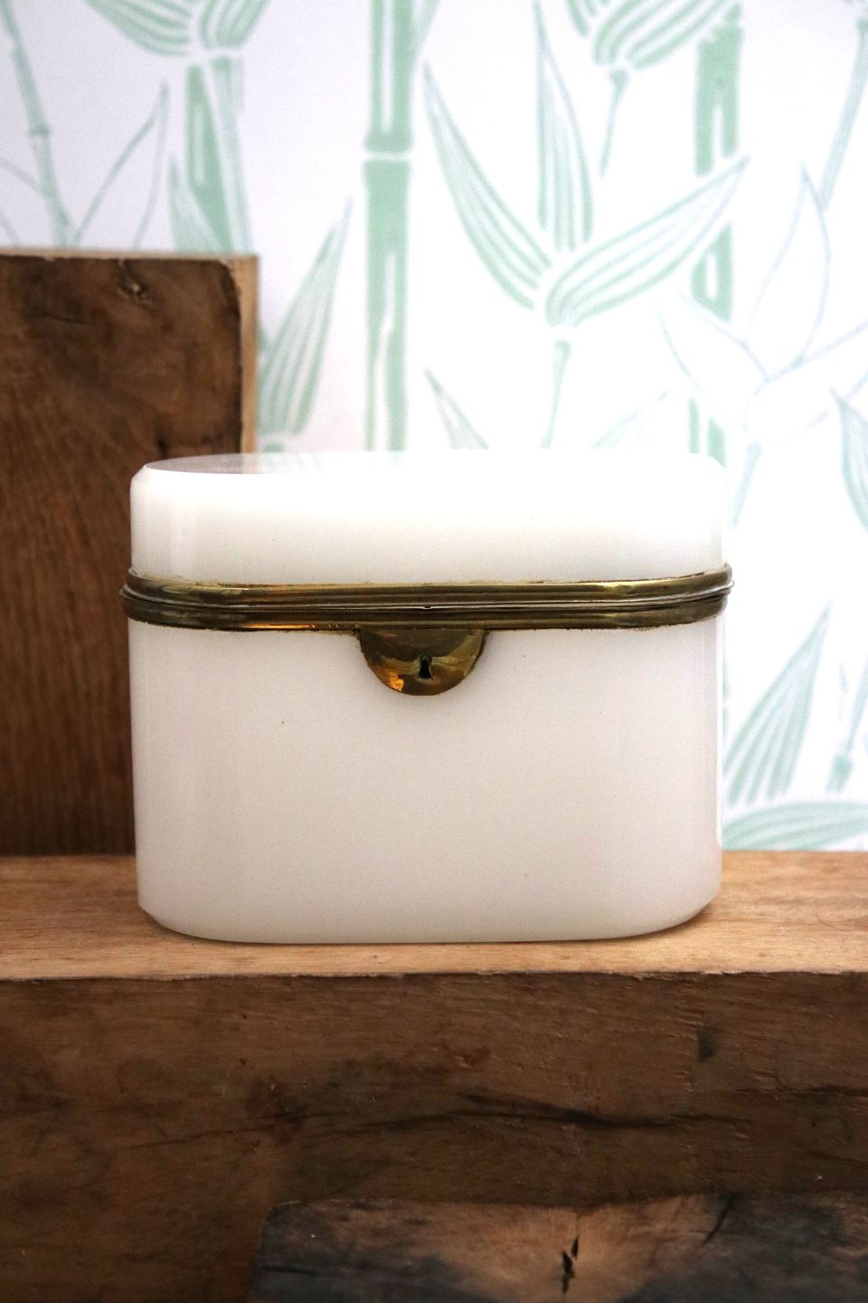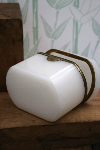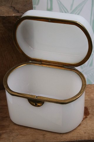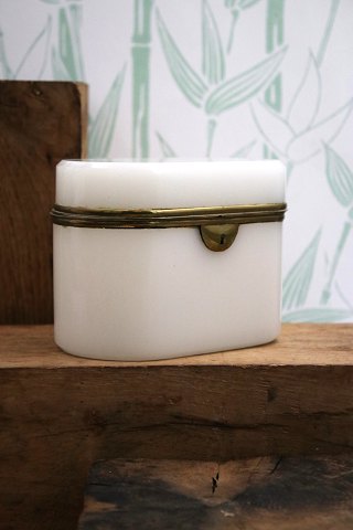 Antique 19th century sugar box in white opal glass with bronze mounting. H: 10.2cm. L&W: 14.5x10cm.Item number: Sukkerskrin nr.2