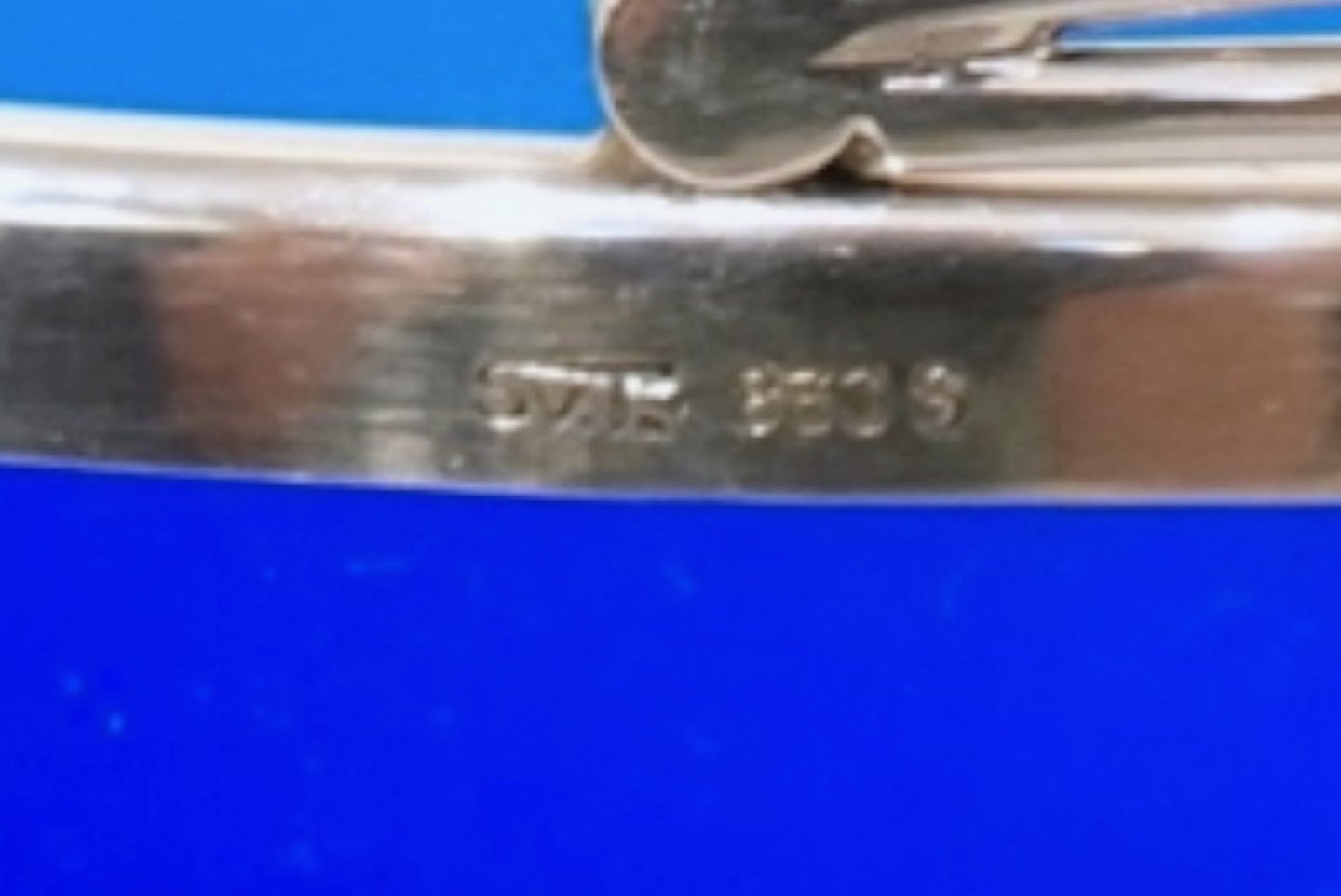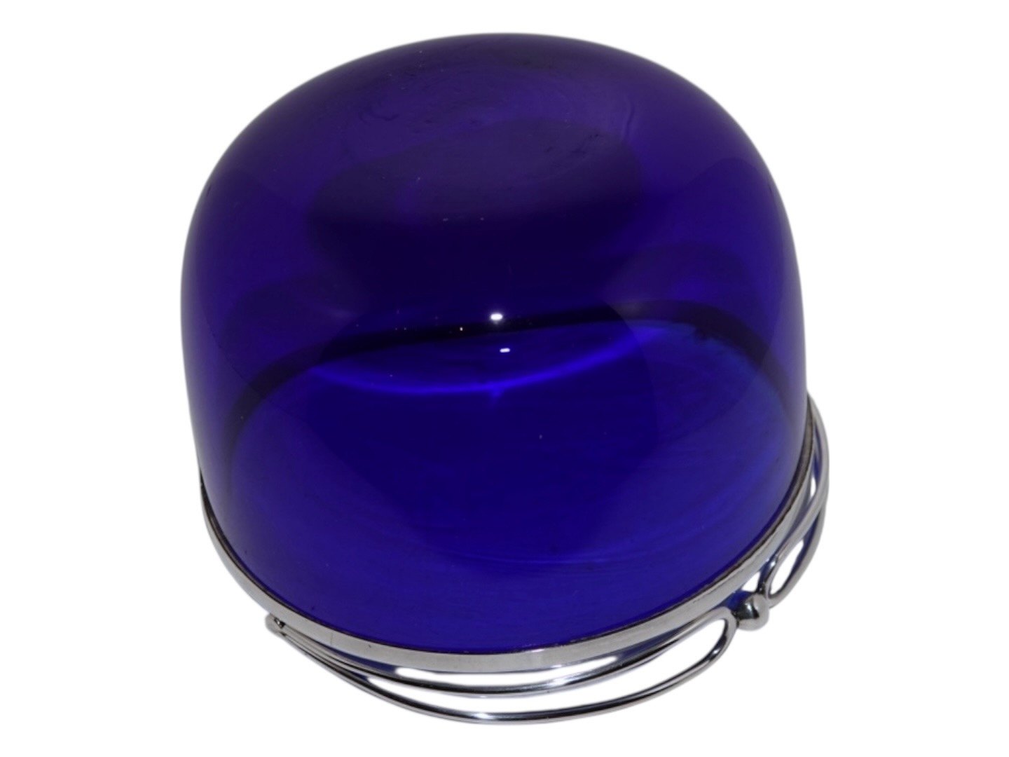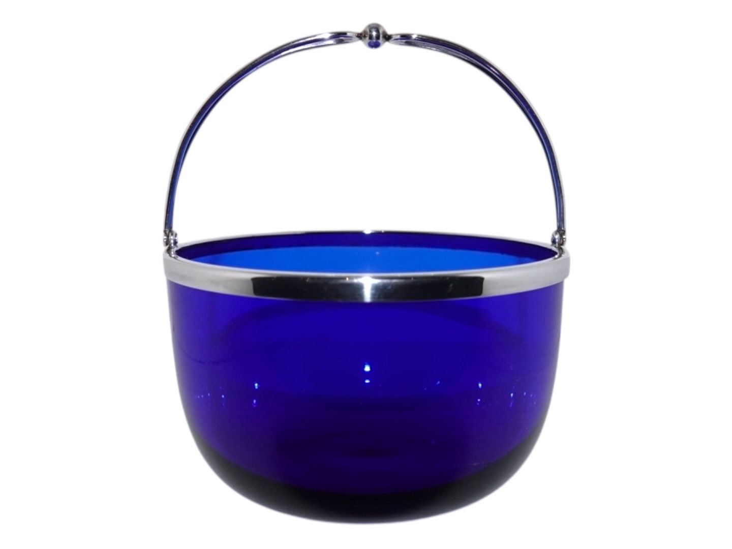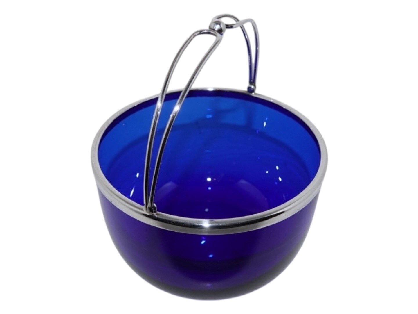 Holmegaard blue glass sugar bowl with silver edge and handle. It is from the 1950'es.The silver was made by silversmith Svend Toxværd. The hallmark is "Sv.T. 830S).