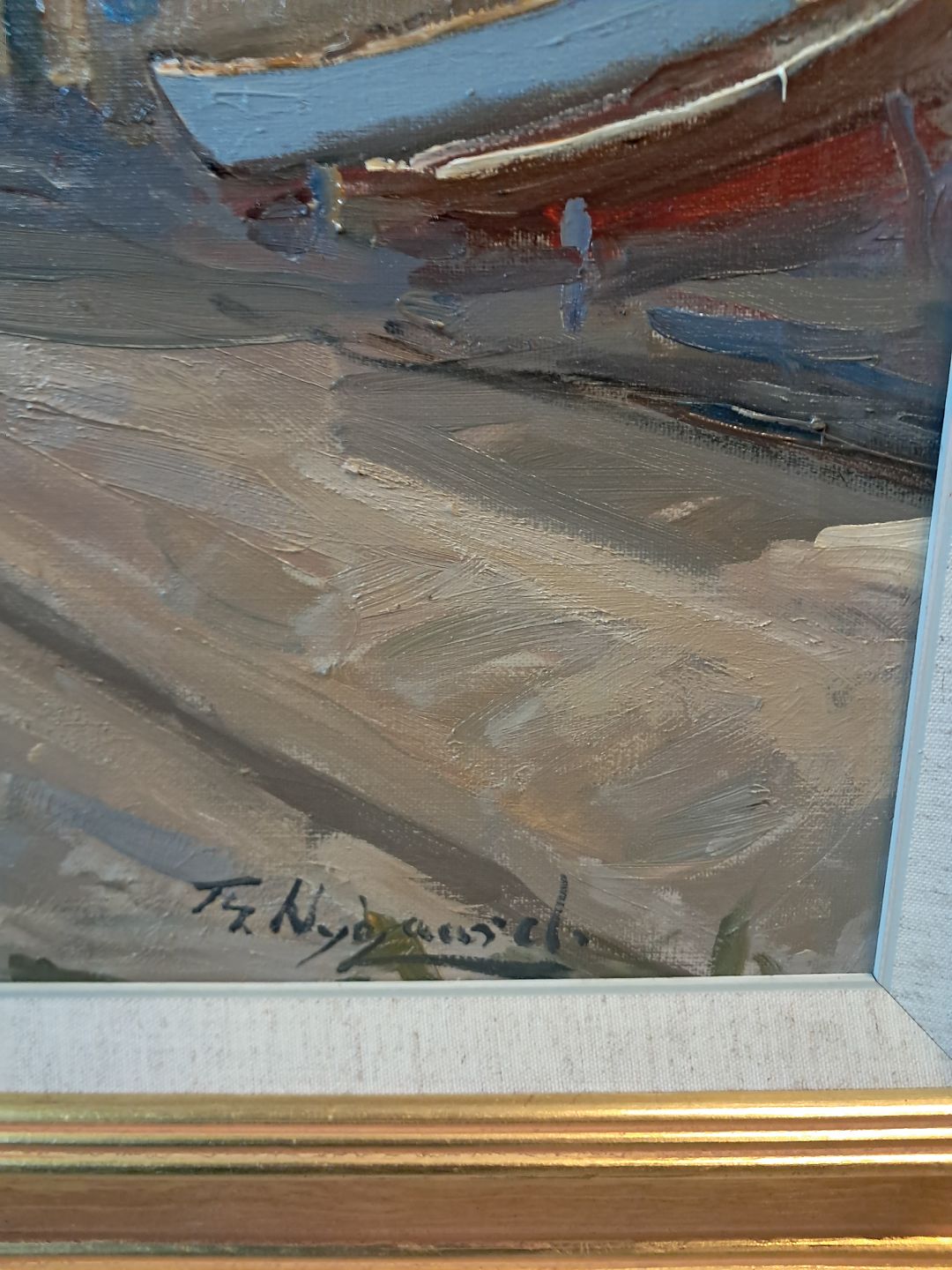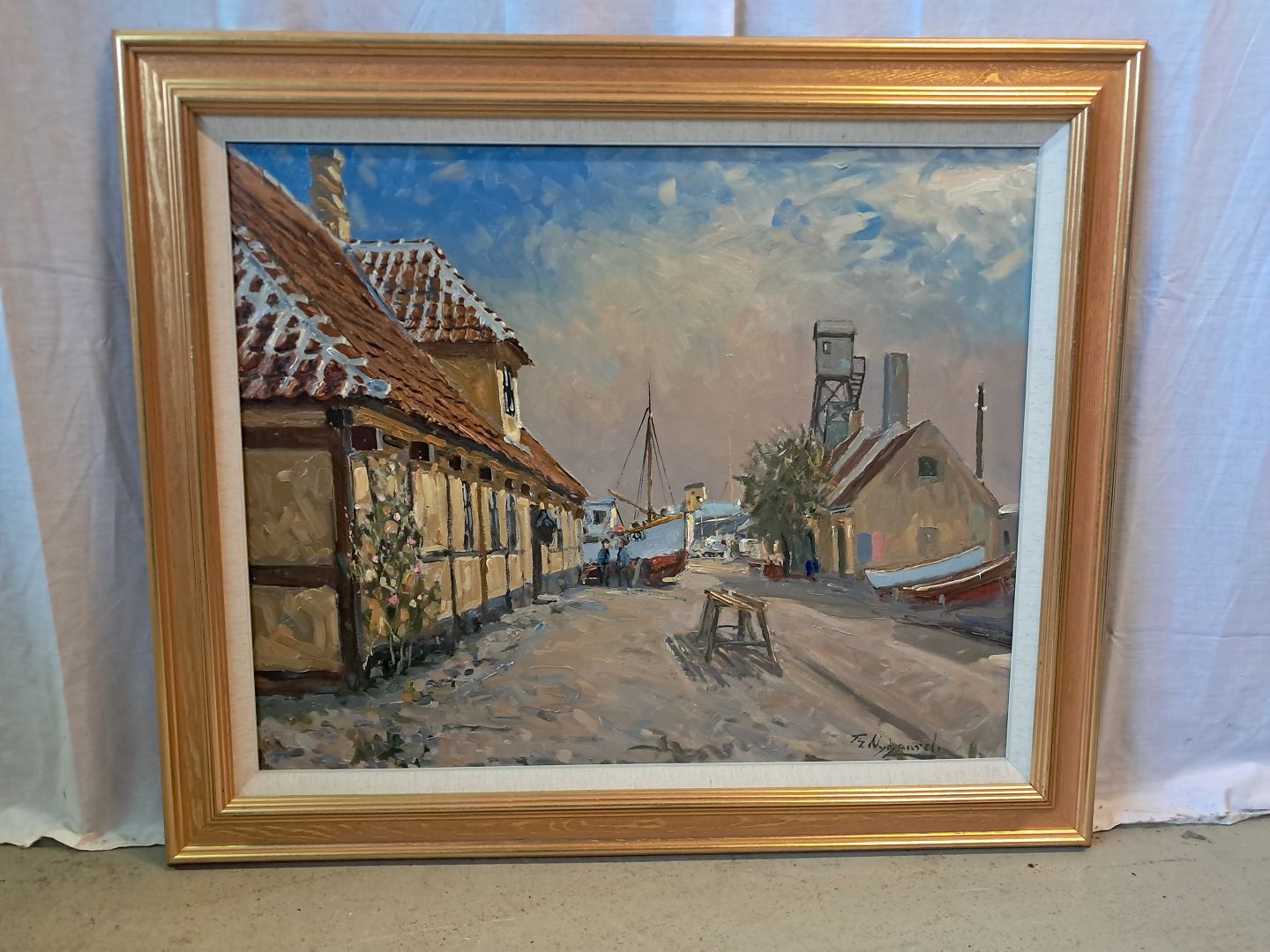 Maleri af Dragør Havn i guldmalet ramme, af : Th. NygaardDet har brugsspor.