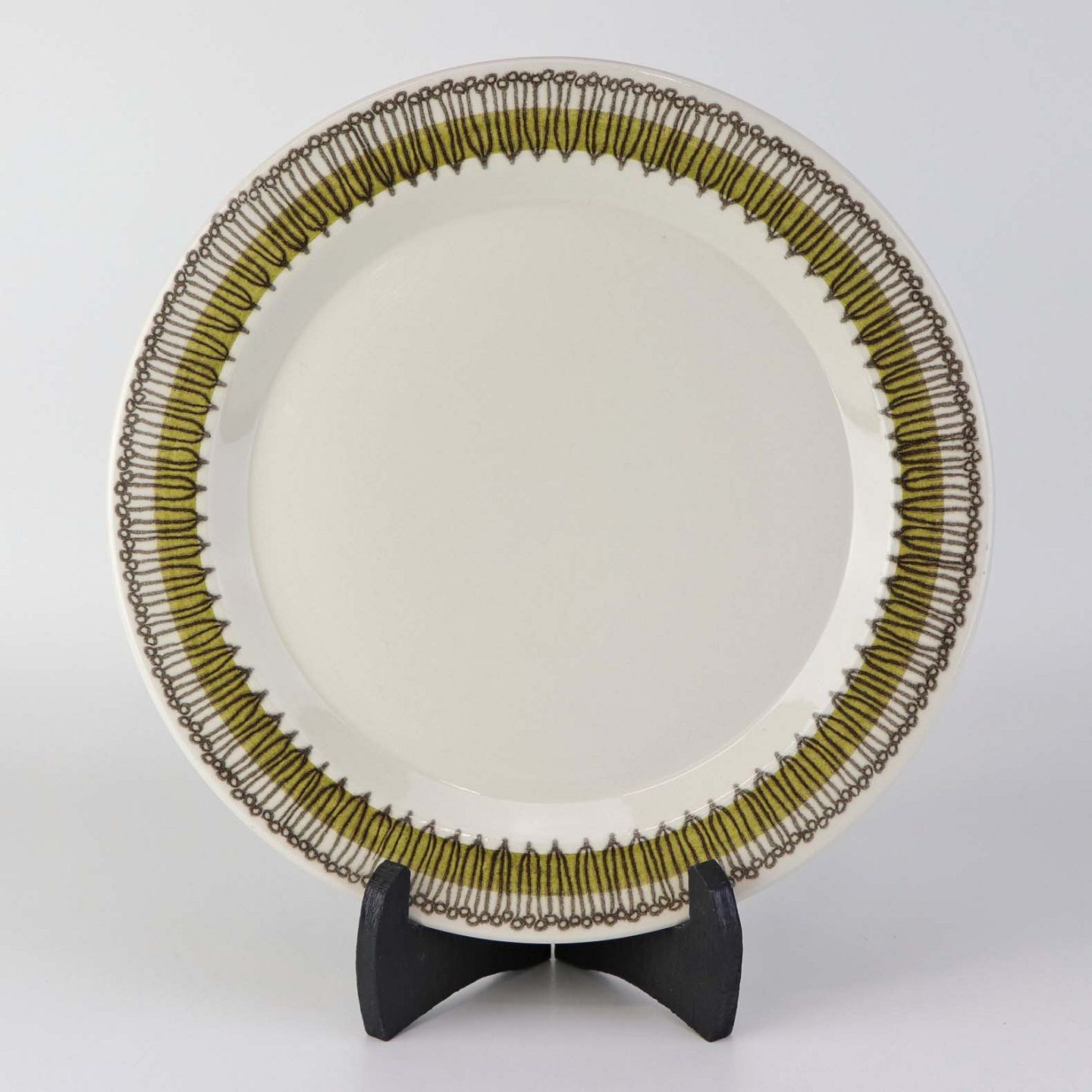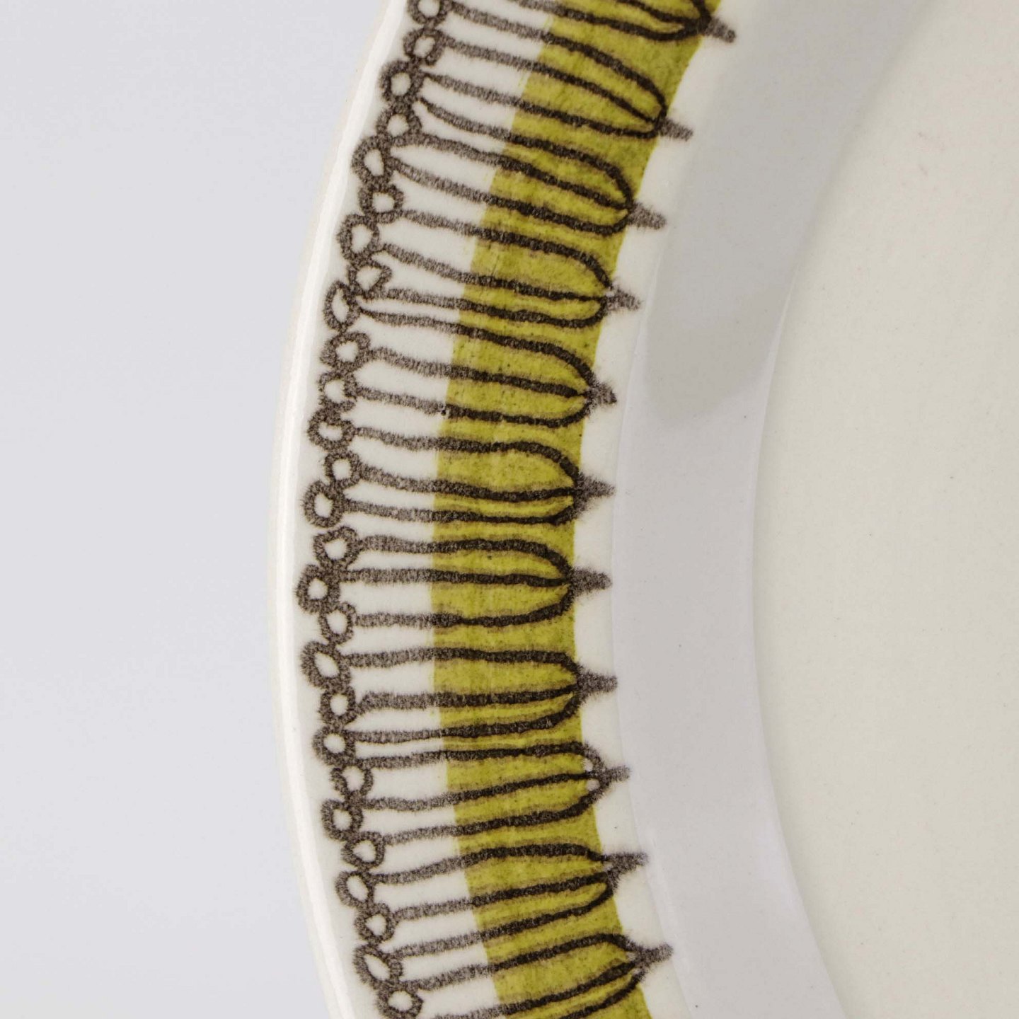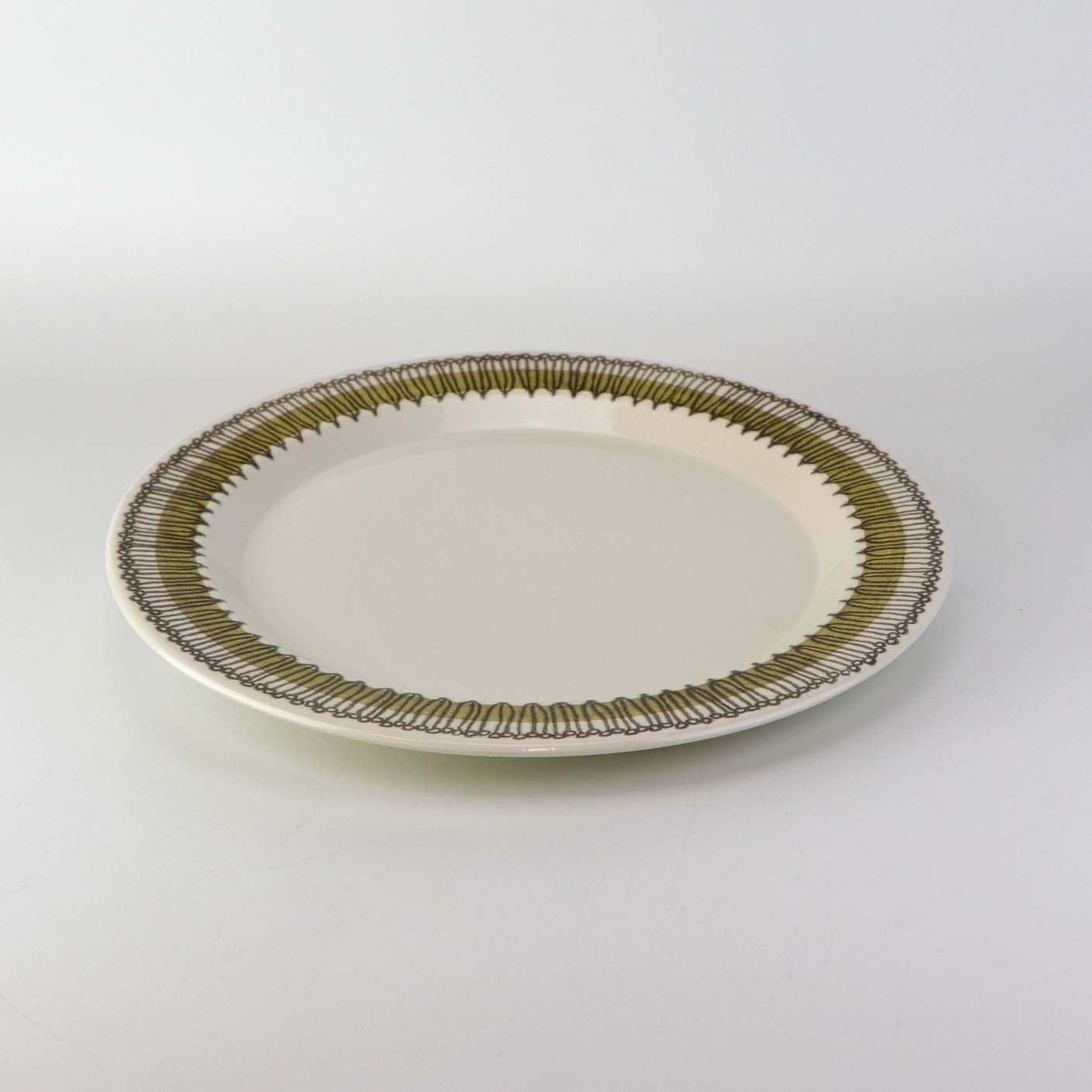 Service i lys fajance dekoreret med abstrakt mønster i sort streg over grøn bort.