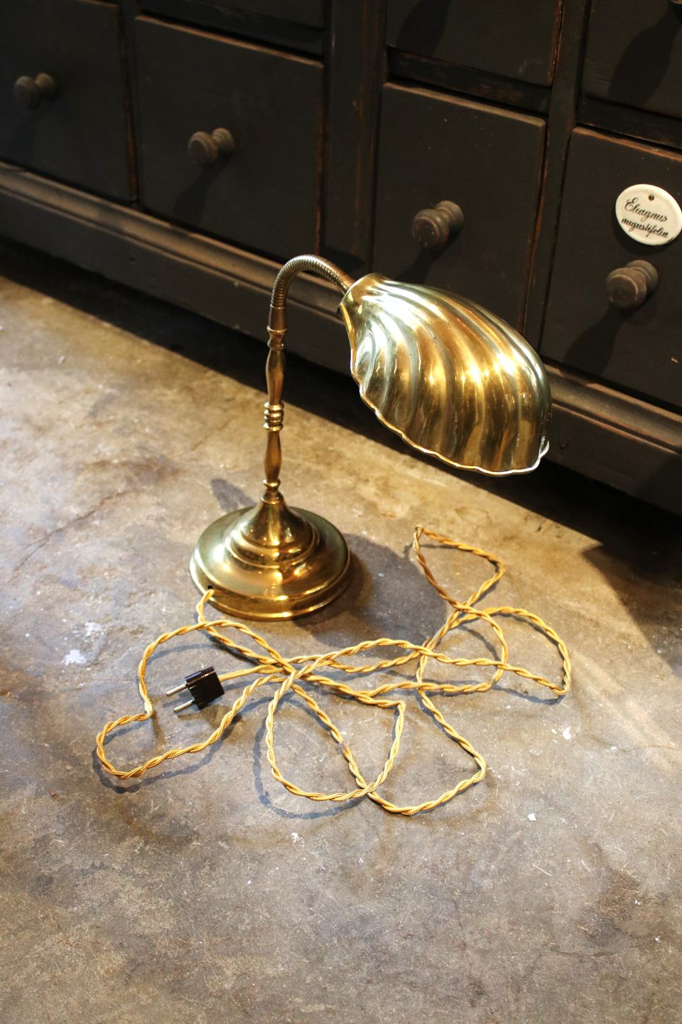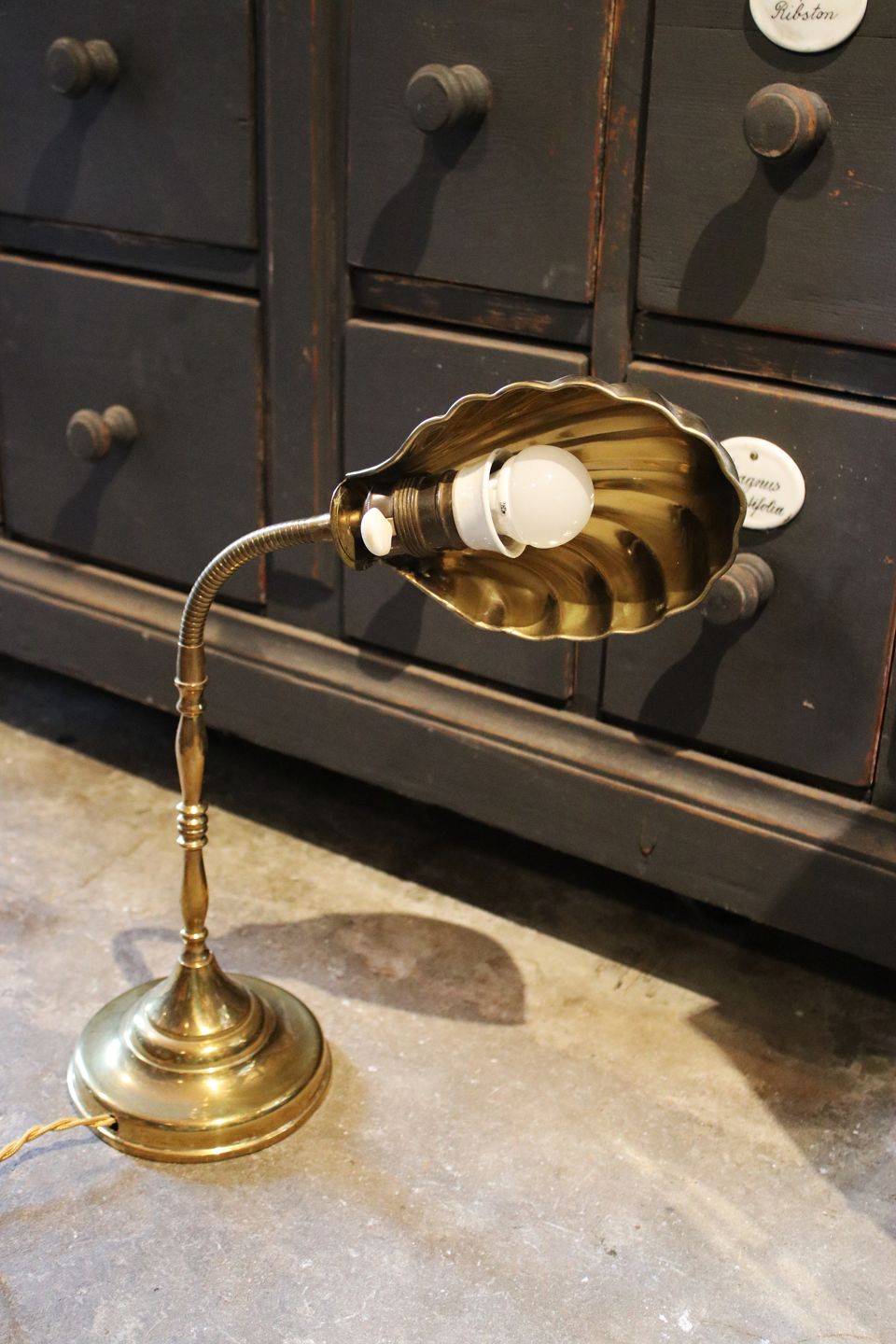 Old table lamp in brass with clam shaped lampshade.Approx. H: 40cm. Clam shade: 19x13cm. Bottom Dia.: 15cm.