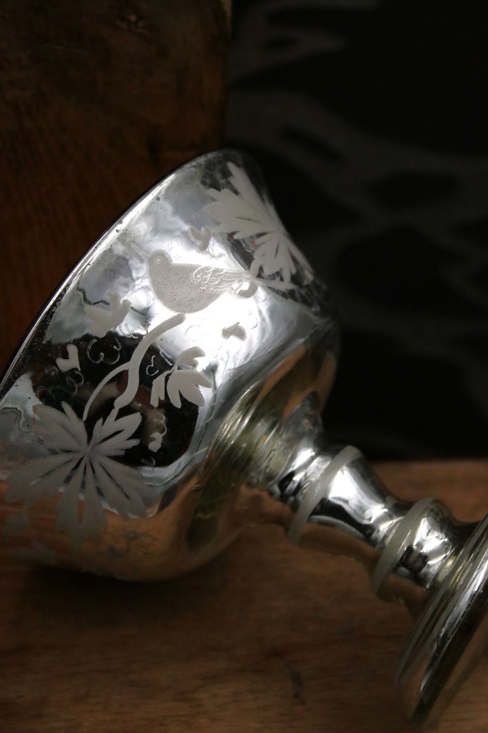 19th century bowl on foot in poor man's silver / Mercury Glass with bird and leaf vine decorations on the side, gold plated on the inside and with a fine patina. H:12.5cm. Dia.:13.5cm.Item number: Fattigmandssølv skål nr.5