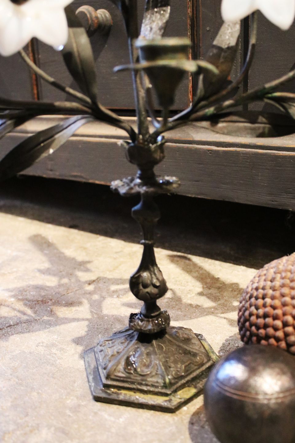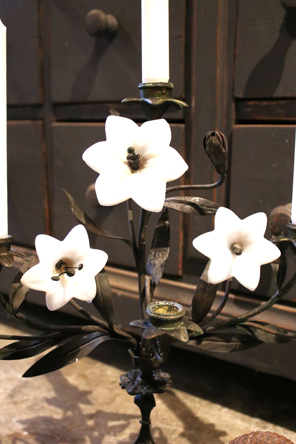 Antique, French candlestick in dark patinated bronze, for 4 candles and decorated with 3 old white glass flowers. H: 42cm. W: 32cm.Item number: Stage nr. 6