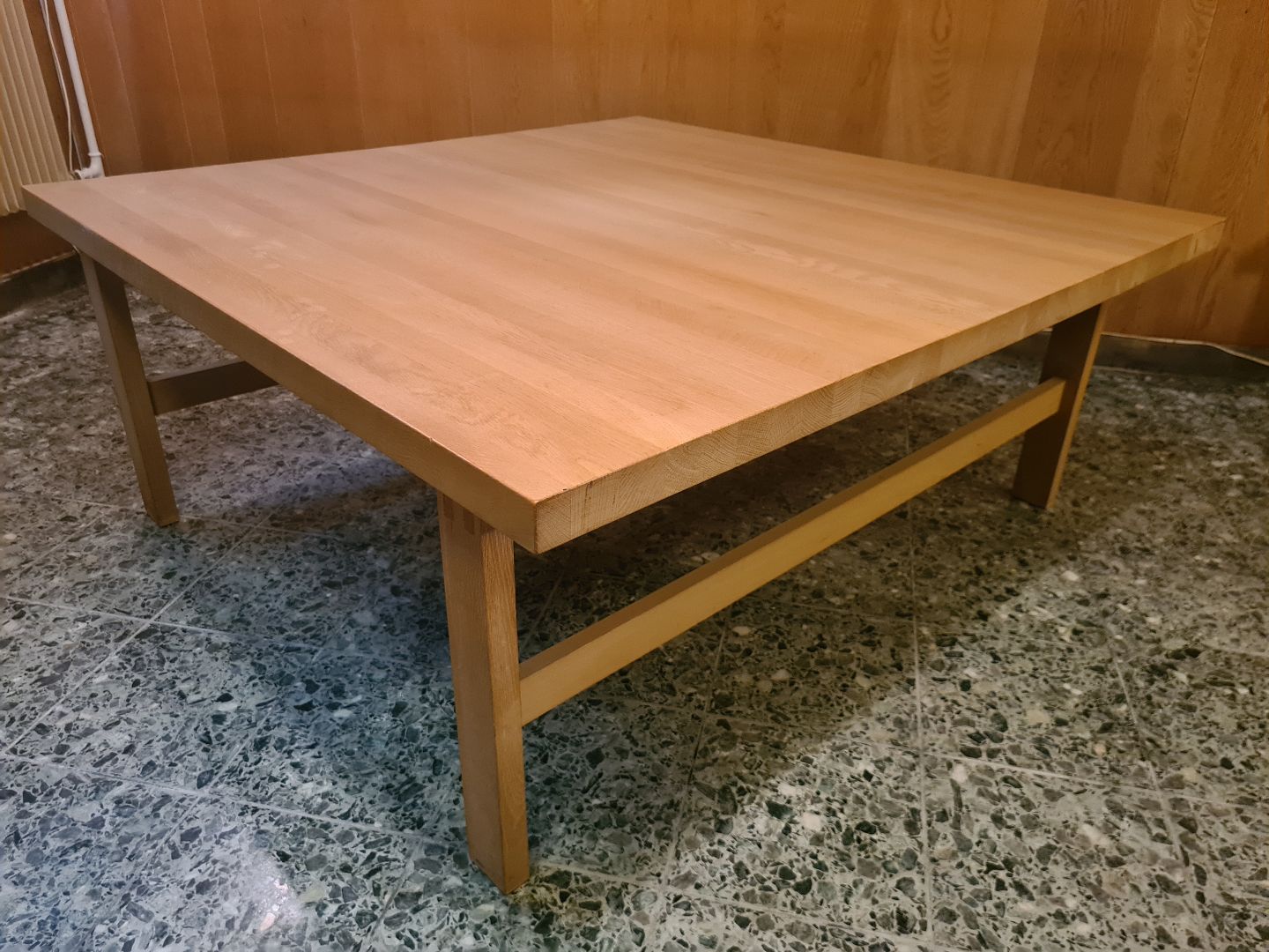 Kvadratisk sofabord fra 1970´erne i massiv eg. Formgivet hos Laboremus i Viborg. Fremstår pænt og velholdt uden nævneværdige brugsspor.Højde 50 cm. Længde 120 cm. Bredde 120 cm.