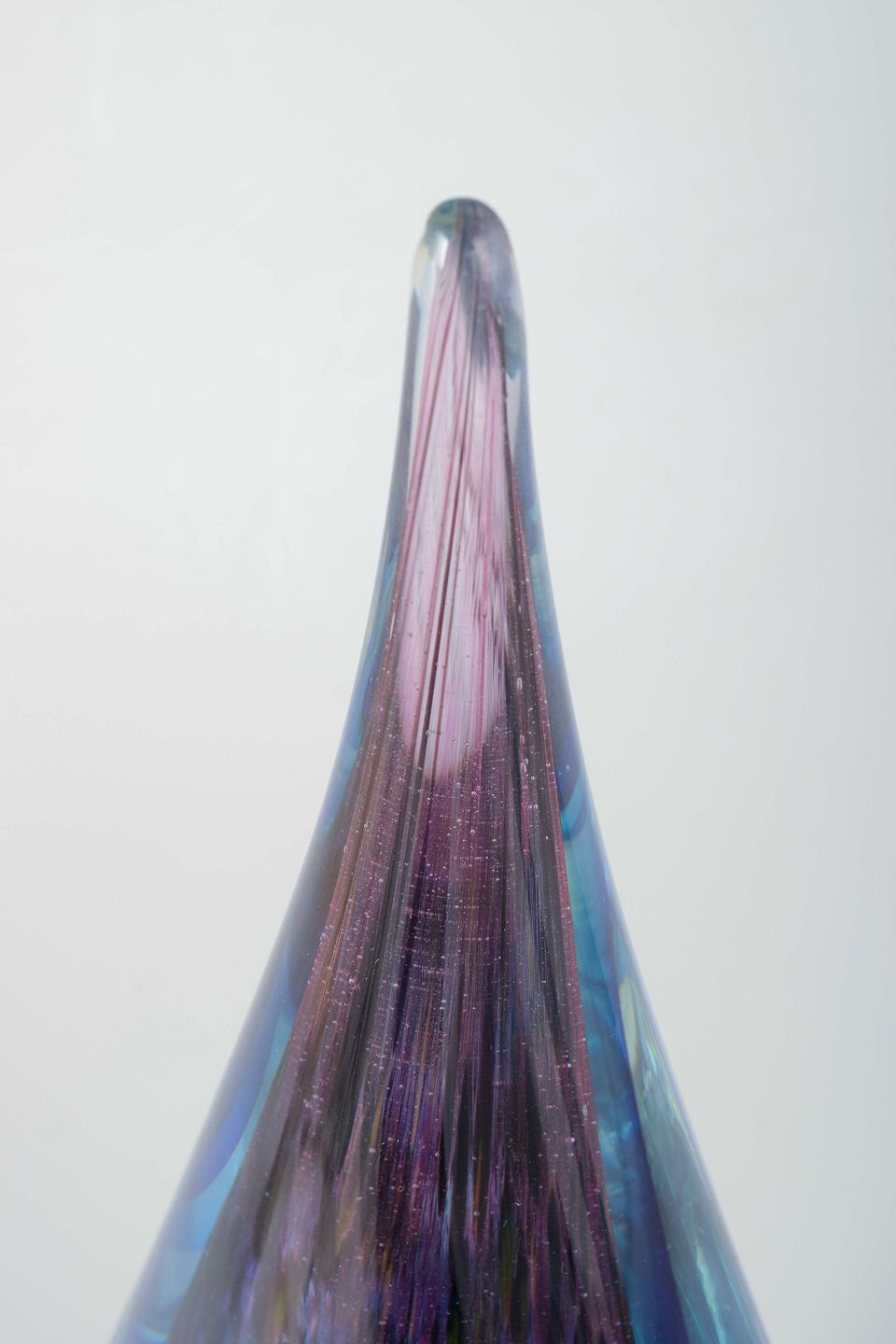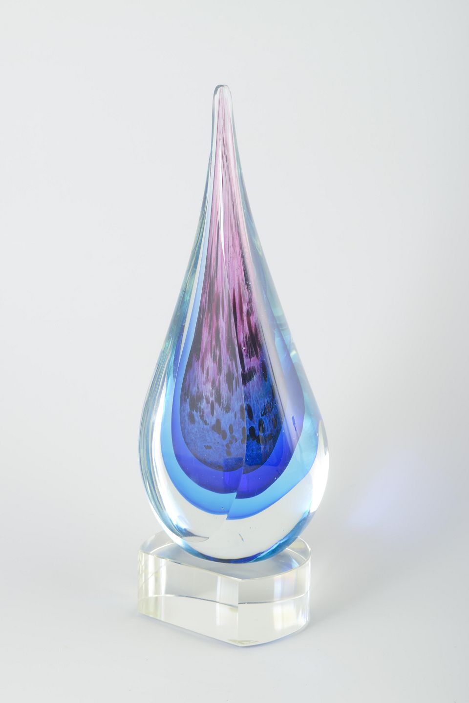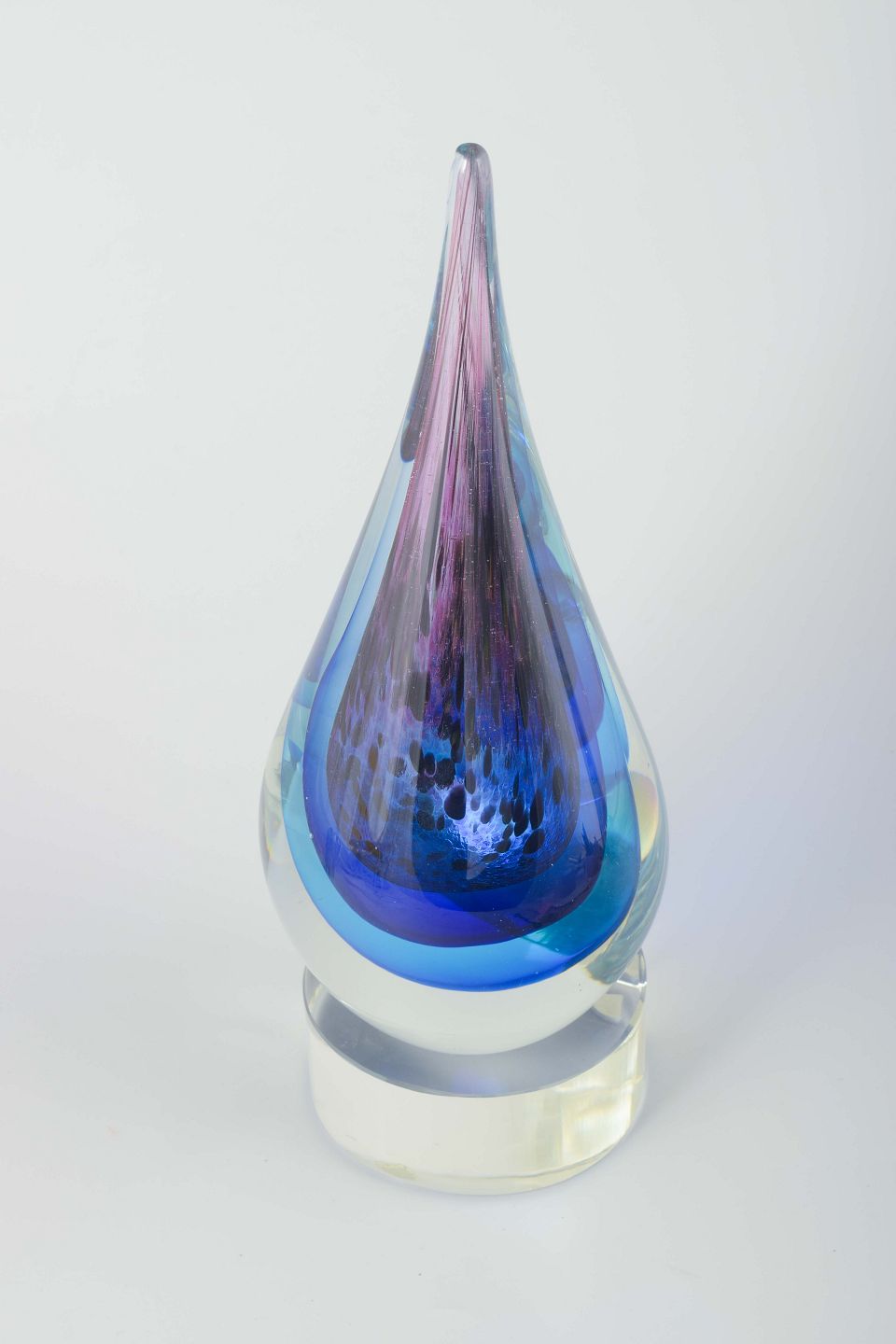 Handmade sculpture in clear glass with internal layers in blue and violet hues, shaped as a drop with an elegant pointed top. Mounted on a round clear-glass base.