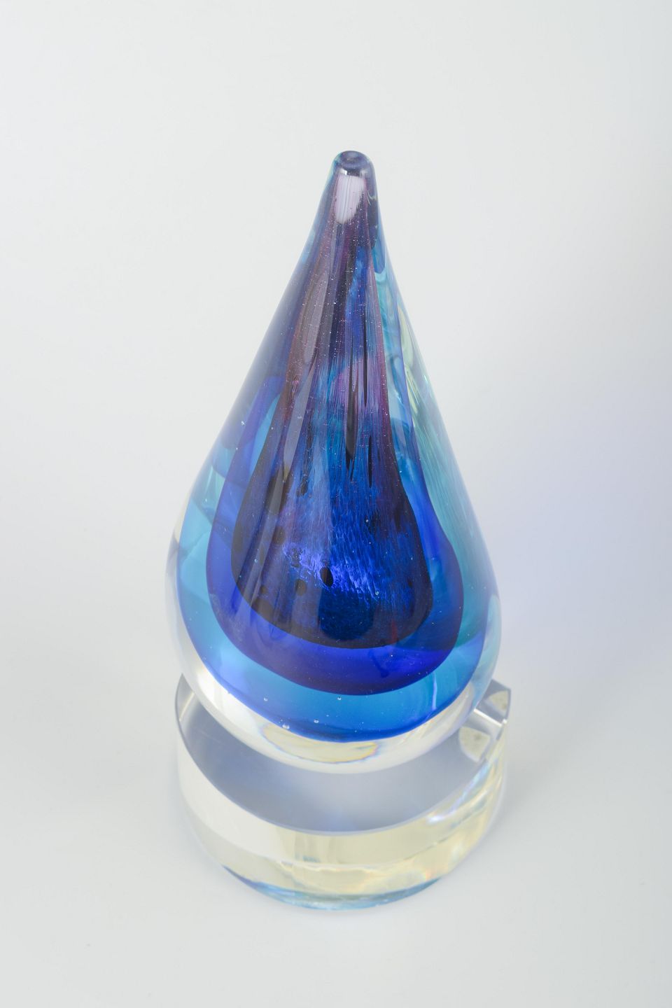 Handmade sculpture in clear and blue-violet glass, shaped as a drop with optical layers and an elegant pointed top. Mounted on a round clear-glass base.