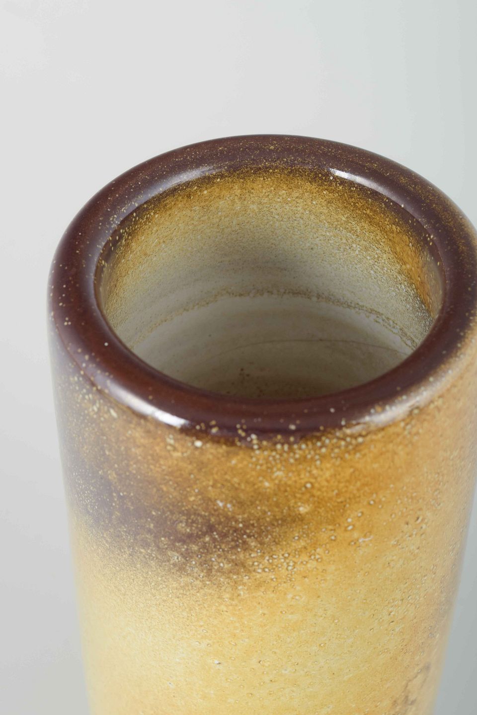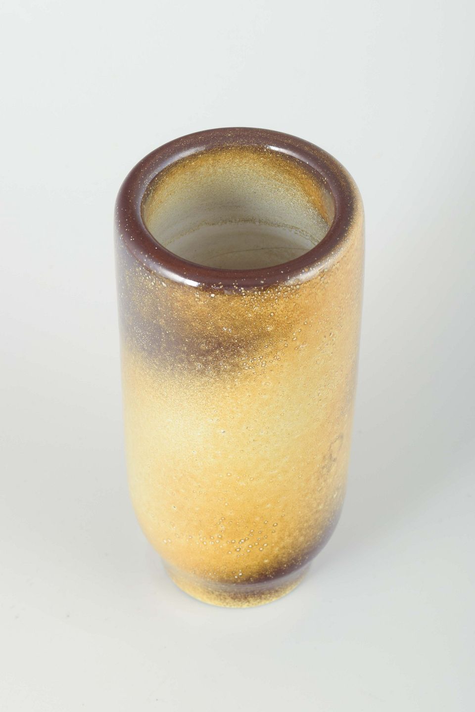 Cylindrical vase in stoneware with flowing glaze in yellow and brown shades, featuring soft transitions between matte and glossy surfaces.