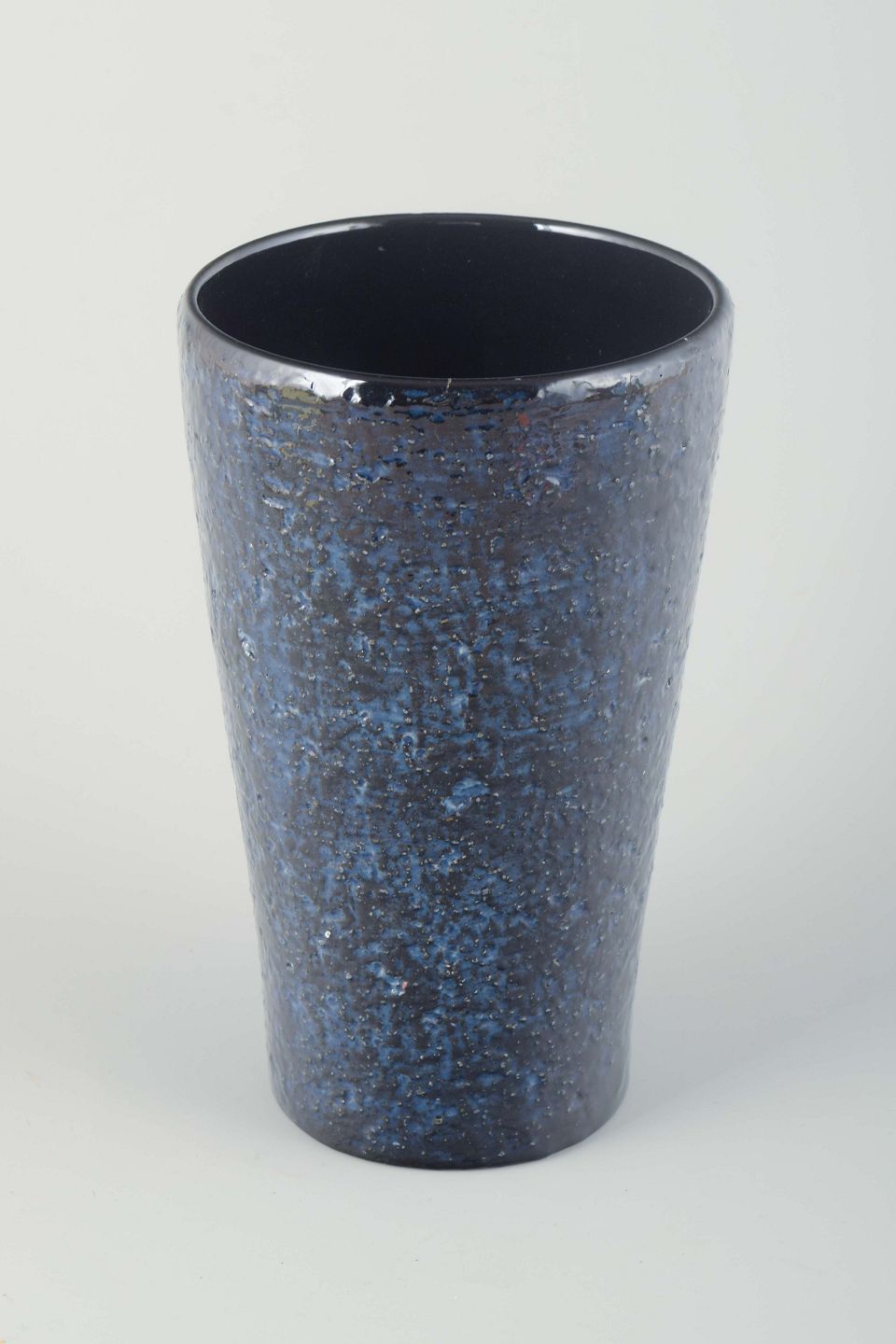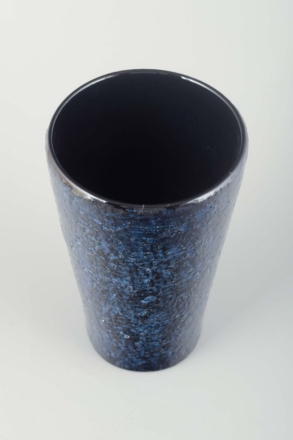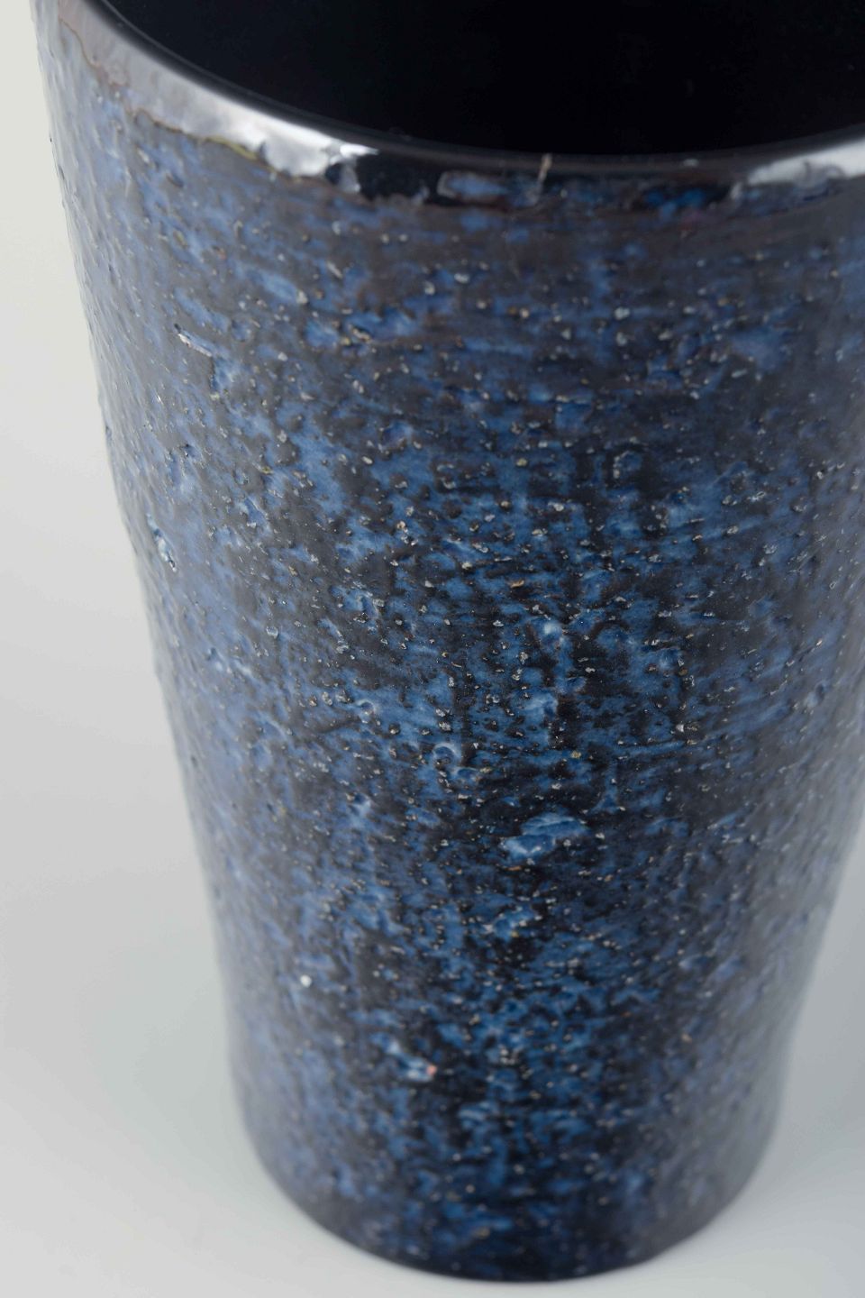 Cylindrical stoneware vase with deep dark blue glaze featuring a subtle crystalline surface texture.