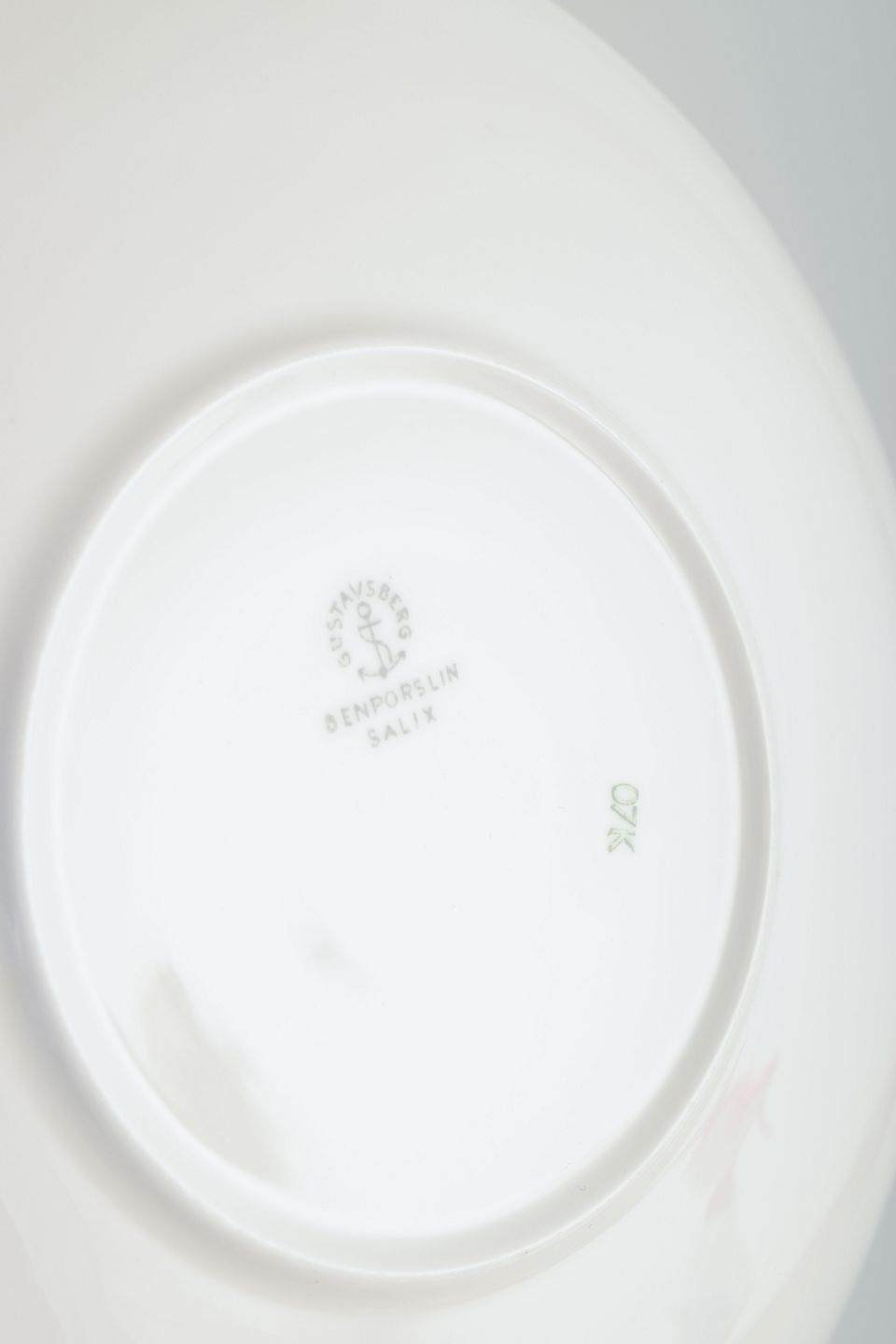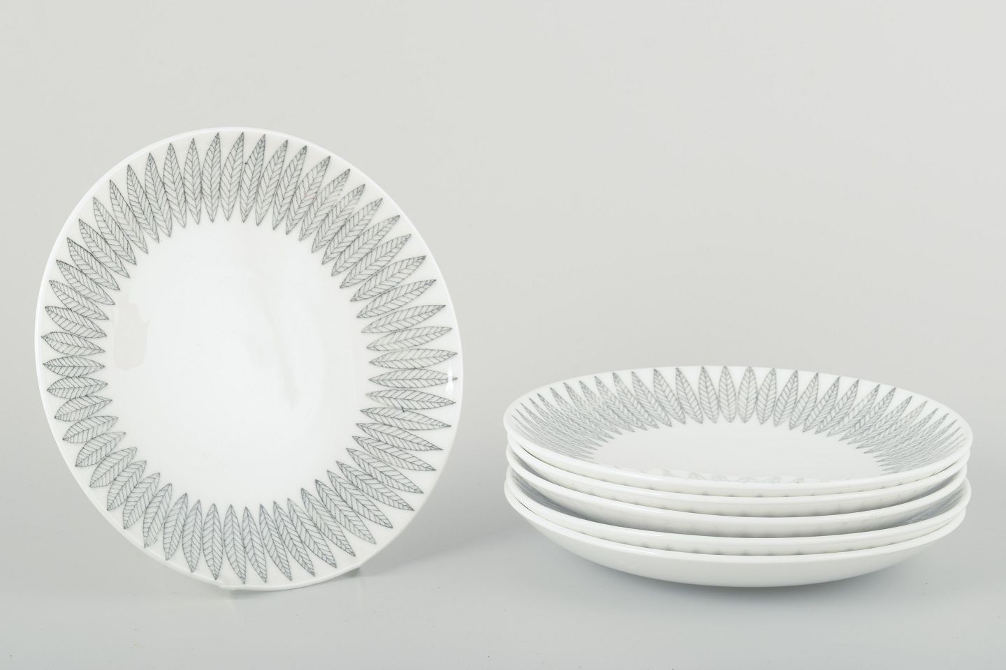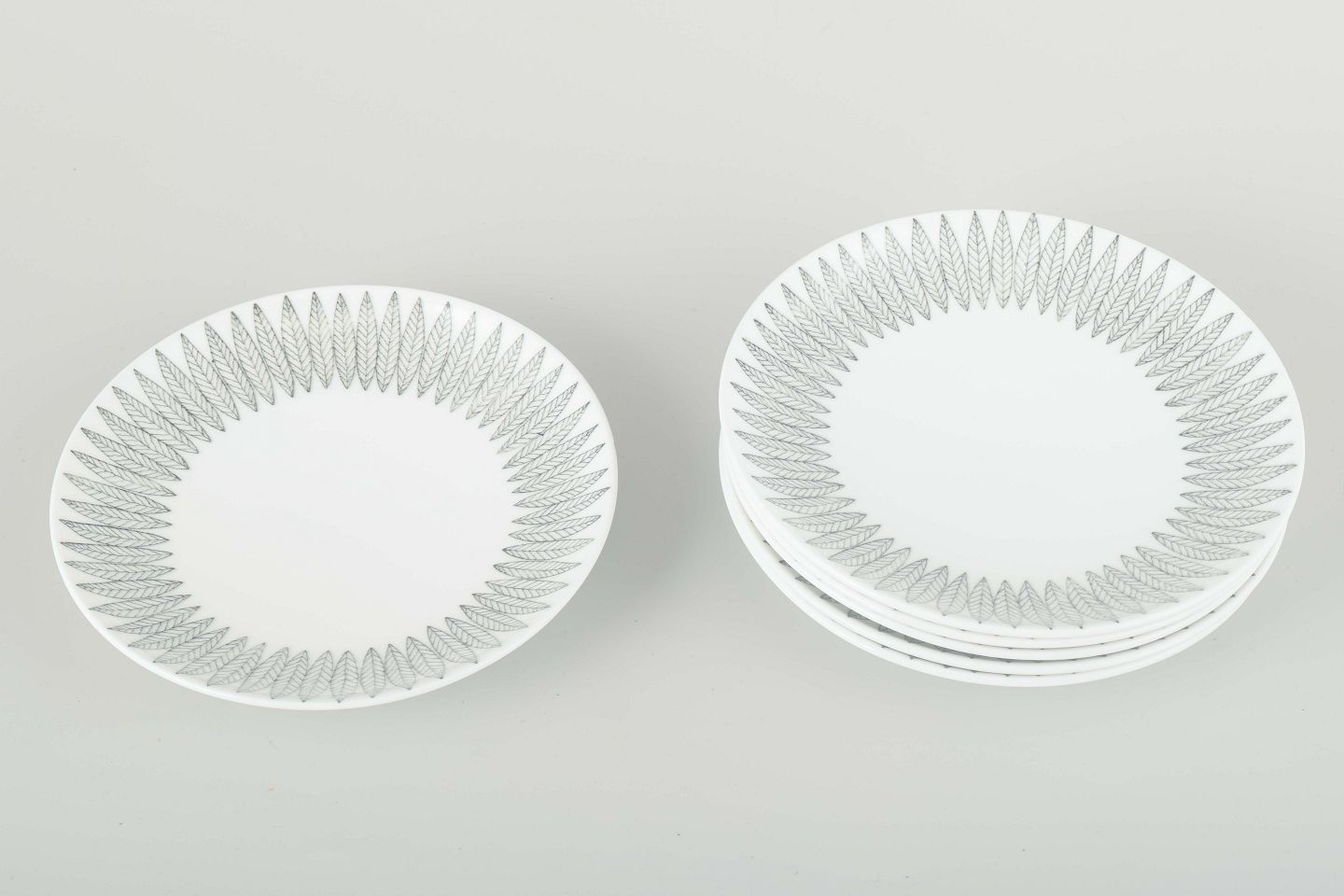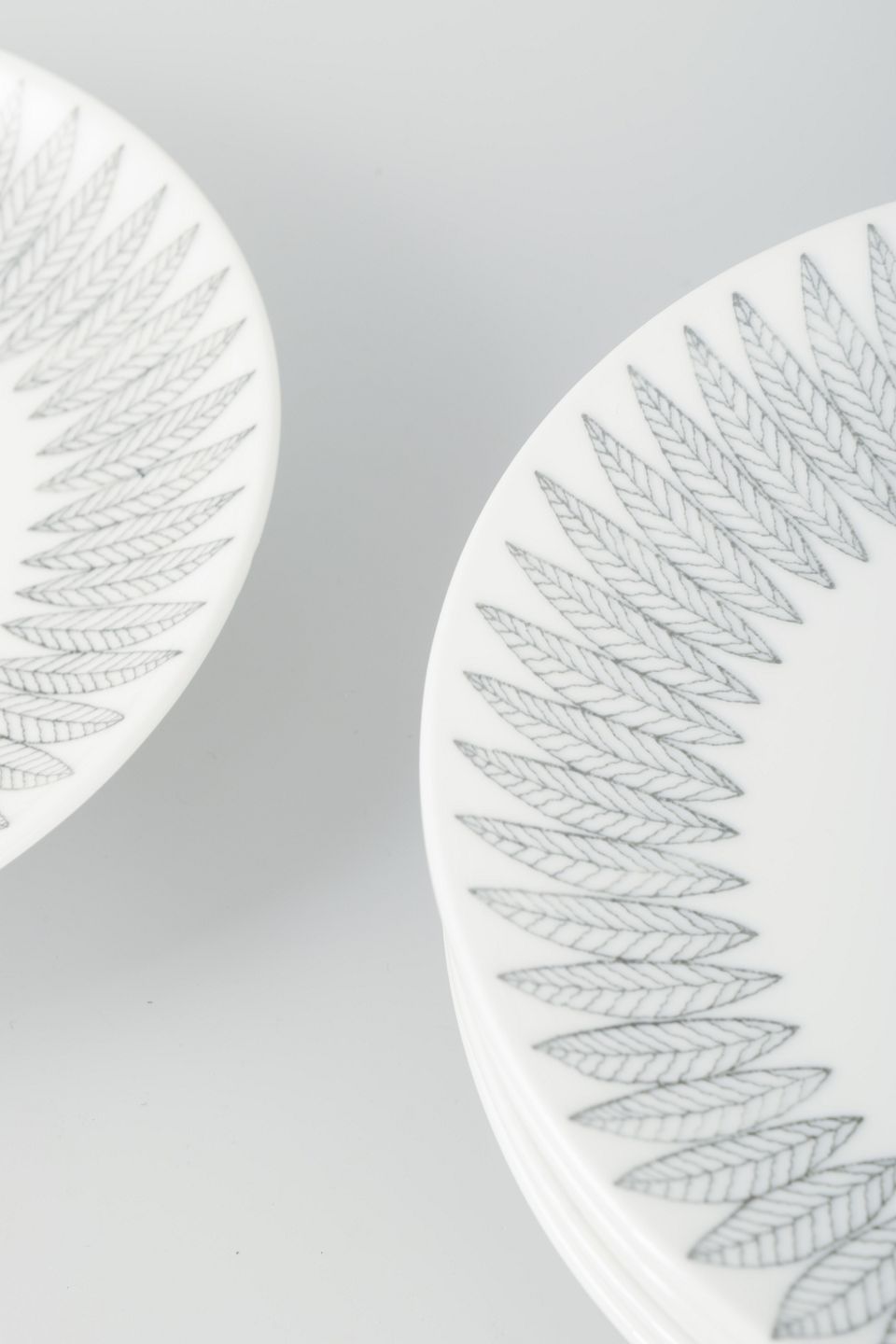 Set of six faience cake plates decorated with the characteristic grey “Salix” pattern on white ground, designed by Stig Lindberg.