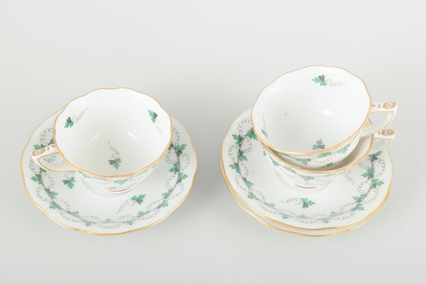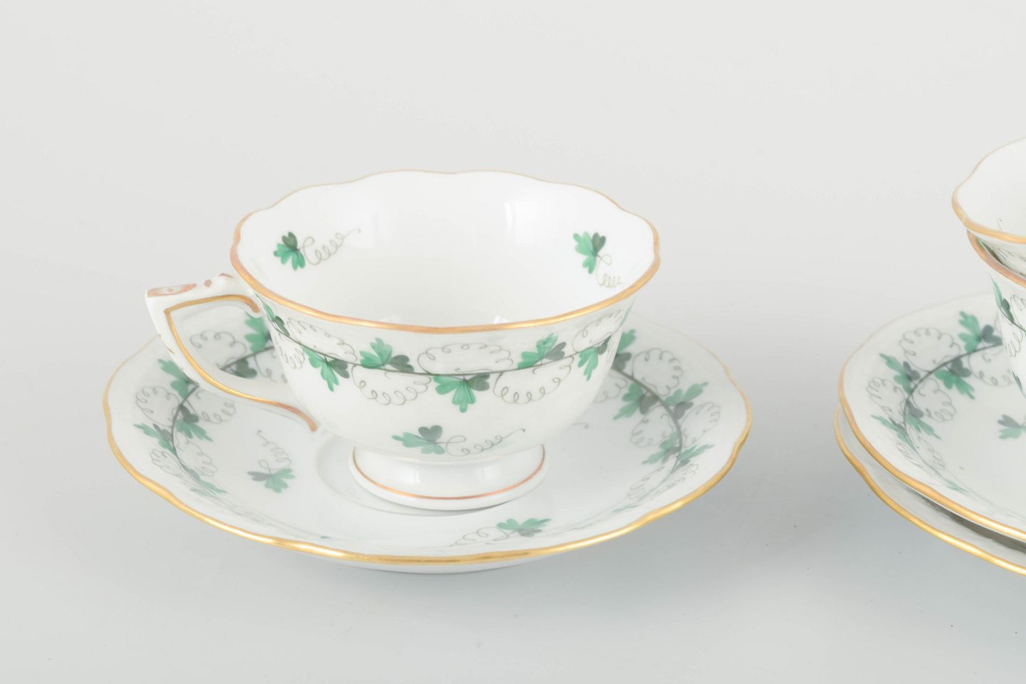 Elegant porcelain set with hand-painted green floral garlands and gilded rims. A classic Herend design featuring refined detailing and gently curved forms.
